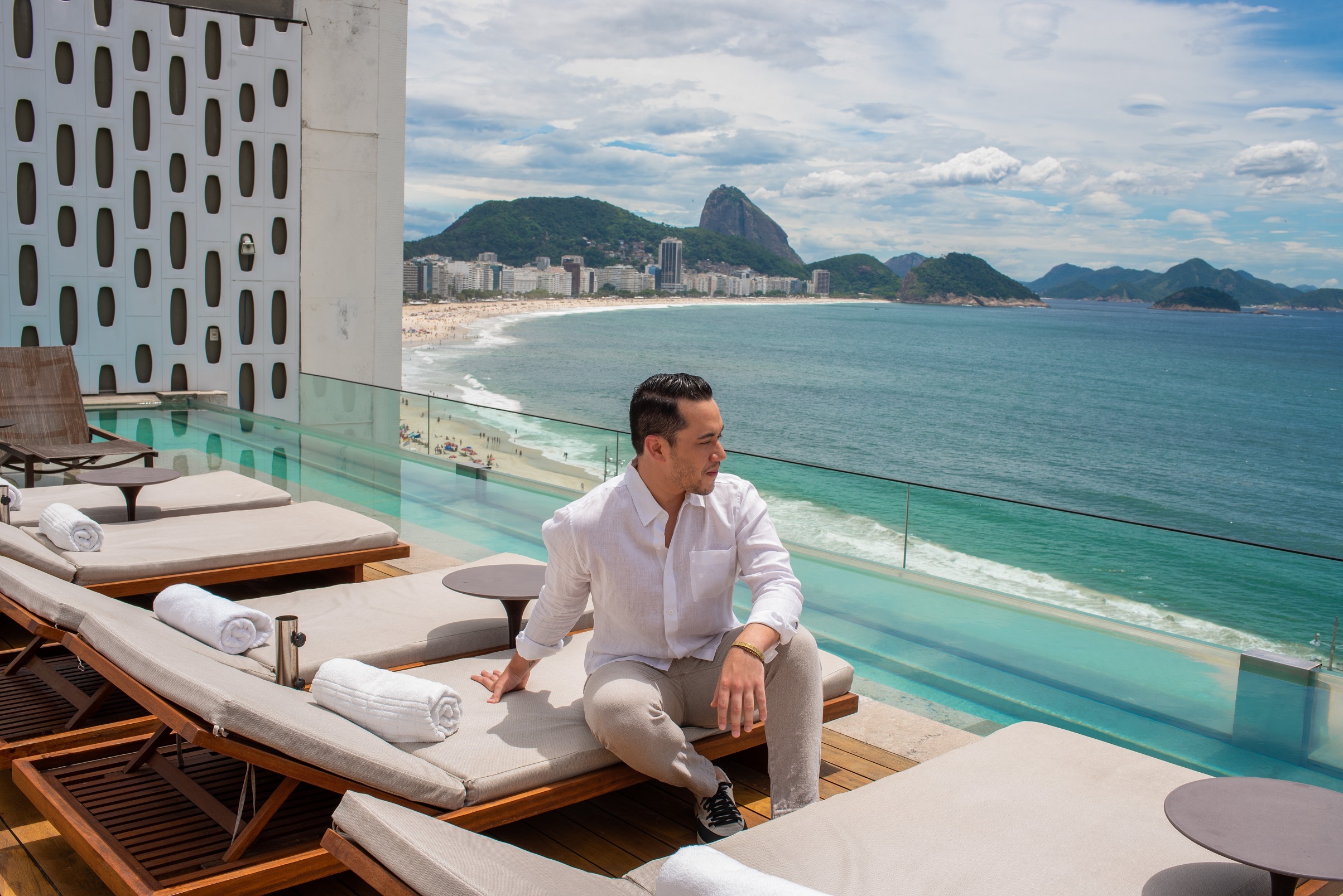 No rooftop, o grande destaque é a piscina de borda infinita, que se confunde com o mar de Copacabana. Espreguiçadeiras, ombrelones, um mini restaurante e a vista ao livre de uma das praias mais famosas do mundo completam o cenário.