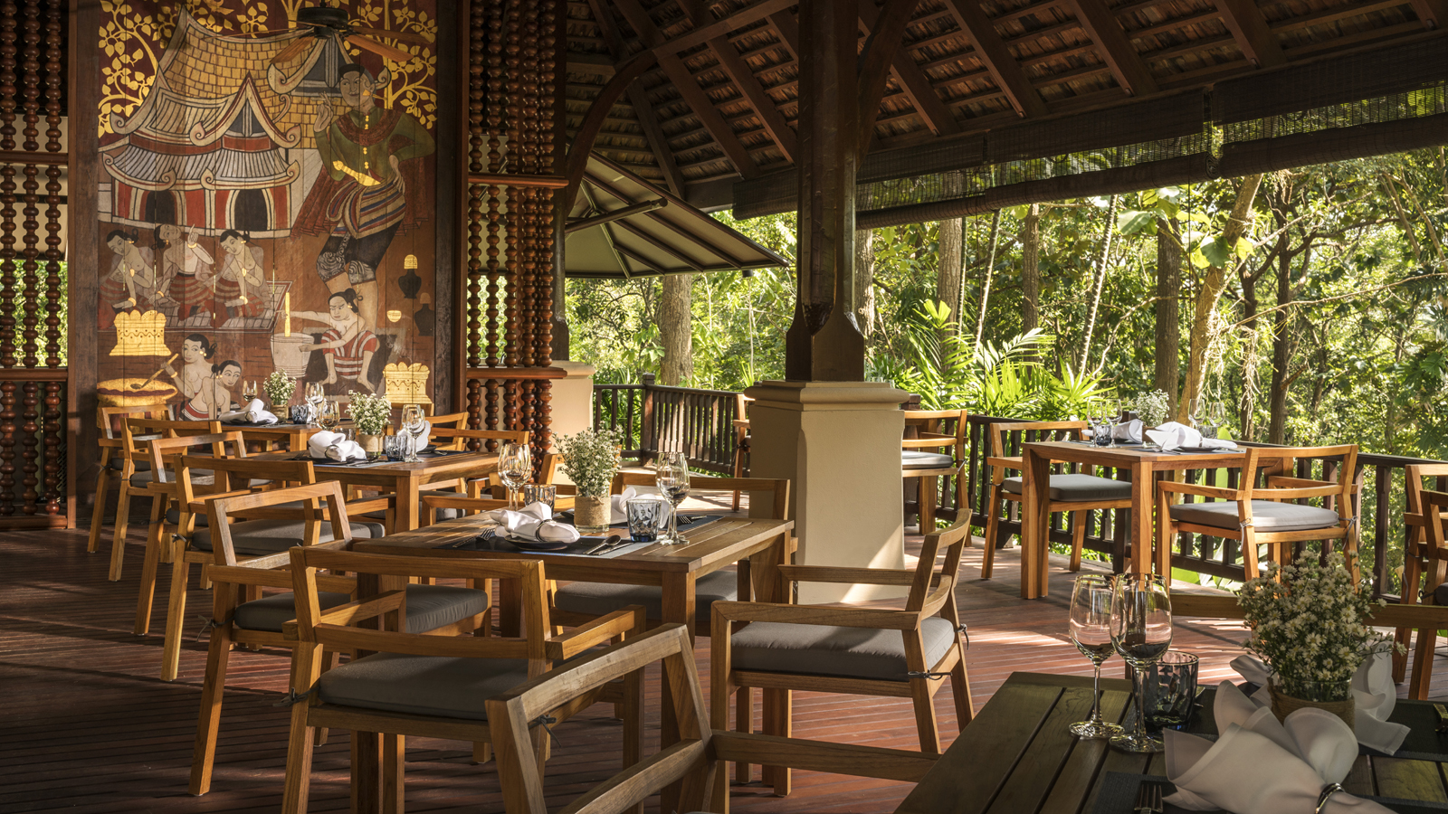 Os quartos são imensos, tem ótima iluminação, camas e travesseiros que abraçam, mini-bar bem equipado, frutas frescas todos os dias, máquina de café e chás variados. Os banheiros são espaçosos, modernos, com janelões de vidro e banheira. As varandas são enormes e têm deliciosos sofás de balanço. Desde cedo, pela varanda, se pode acompanhar o trabalho dos camponeses na plantio do arroz, que depois de colhido, abastece o próprio hotel, que aliás tem uma cozinha dos deuses, desde o café da manhã ao jantar, seja no restaurante italiano Terraces ou no Sala Mae Rim de culinária tailandesa.