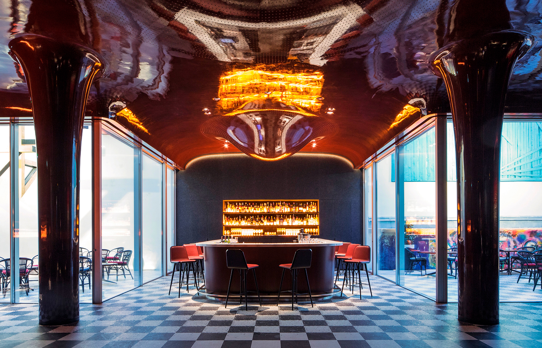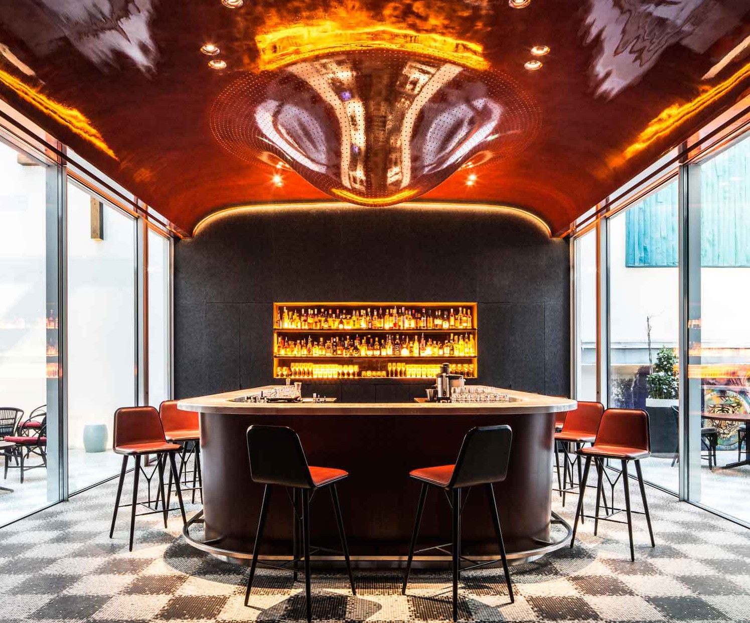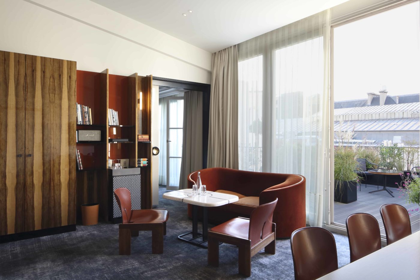 O hotel foi projetado pelo premiado arquiteto Vincent Bastie que reconfigurou radicalmente o edifício, ampliando seus volumes, respeitando sua história e sua grande fachada. No Les Bains, o bar é uma exibição brilhante de ousadia arquitetônica. Os tetos se curvam, as paredes desaparecem na escuridão e as luzes refletem nas superfícies que não apenas criam clima, mas parecem dobrar o tempo. Já nos interiores, Les Bains contratou os designers Tristan Auer e Denis Montel. Auer, que projetou os quartos, foi recentemente nomeado “um dos 10 melhores designers de interiores contemporâneos, estrelas de amanhã” pela Architectural Digest. Montel, que é responsável pelas chiques boutiques francesas Hermes em todo o mundo, é o homem por trás do restaurante / salão do Les Bains. Talvez a maior conquista de Les Bains seja a capacidade de apresentar espaços que criam ambientes totalmente diferentes.