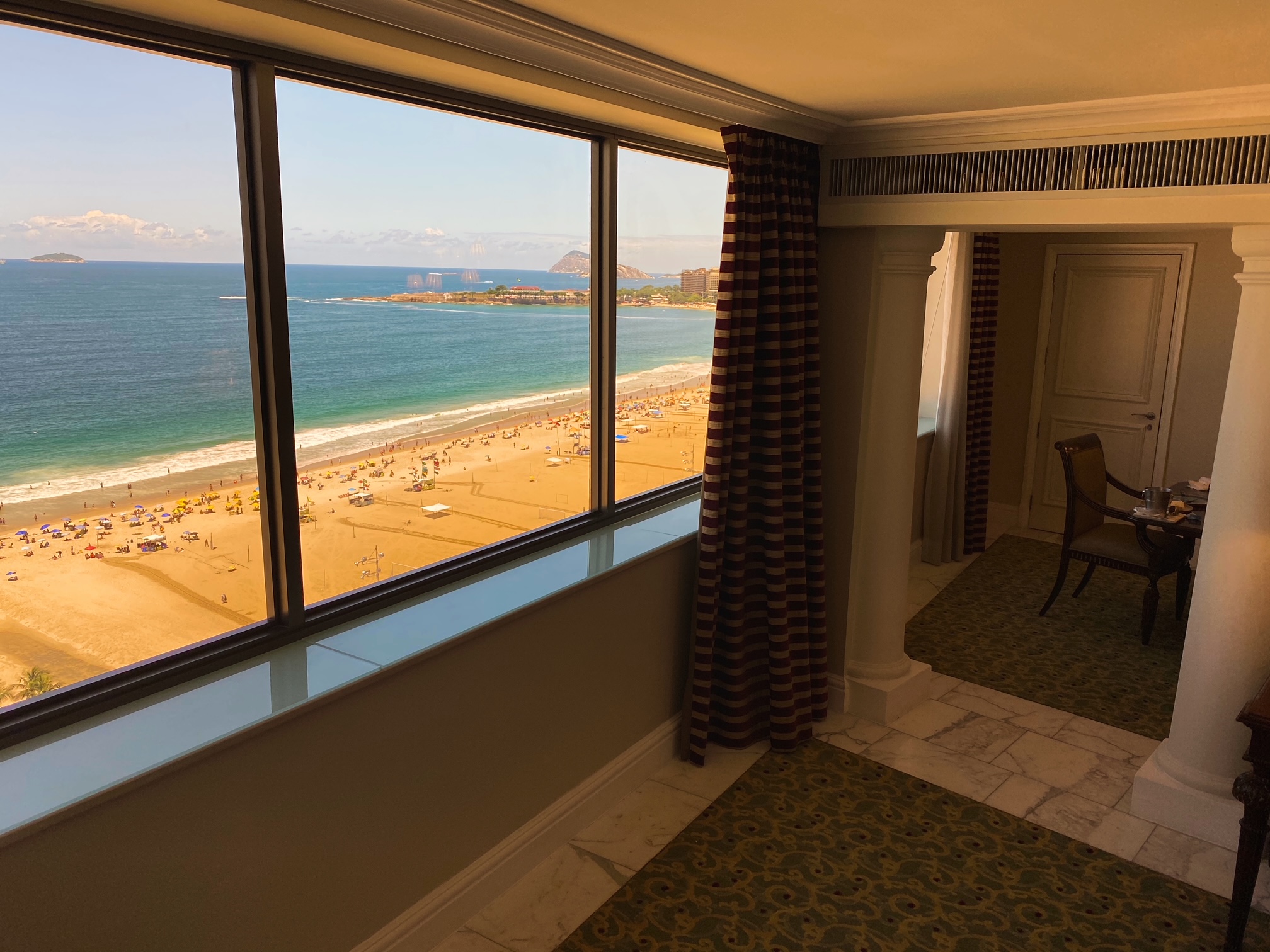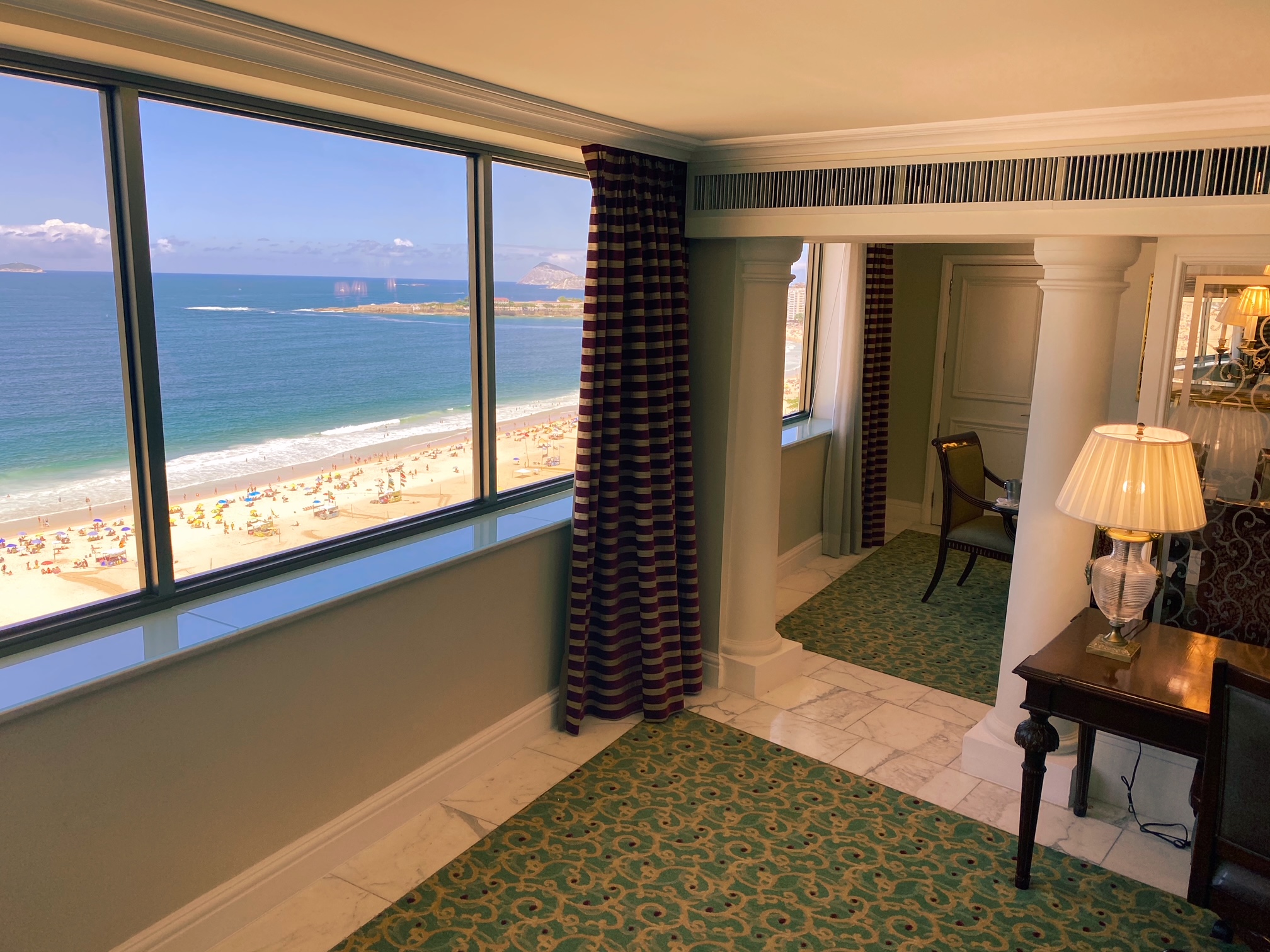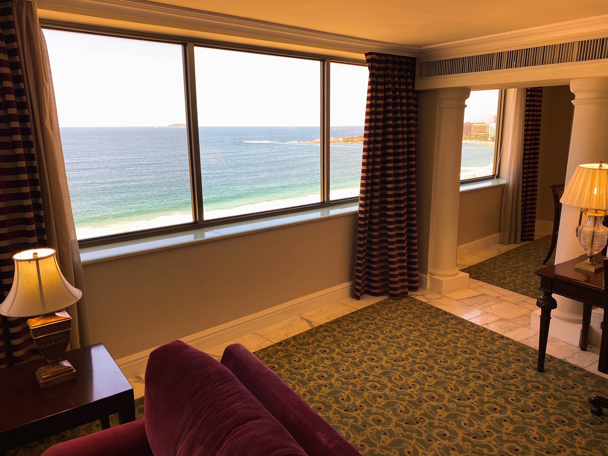 O ápice de se hospedar na presidencial do JW, situada no décimo sétimo andar do prédio, é a vista deslumbrante para a Praia de Copacabana. A suíte (salão, sala de jantar e quarto), é cercada ponta a ponta por um janelão debruçado sobre o mar. Pela manhã, à tarde ou à noite, não importa o horário, o visual da Avenida Atlântica foi o protagonista. Depois da vista, pontos para a cama, e em tempos de pandemia, pontos também para todos os protocolos de segurança e saúde que estão sendo adotados pelo hotel. Estar no JW Marriott é vivenciar o verdadeiro estilo American Way of Life. Tive a sorte de despertar cedo e apreciar um dos mais bonitos nascer do sol, bem ali, na minha frente.