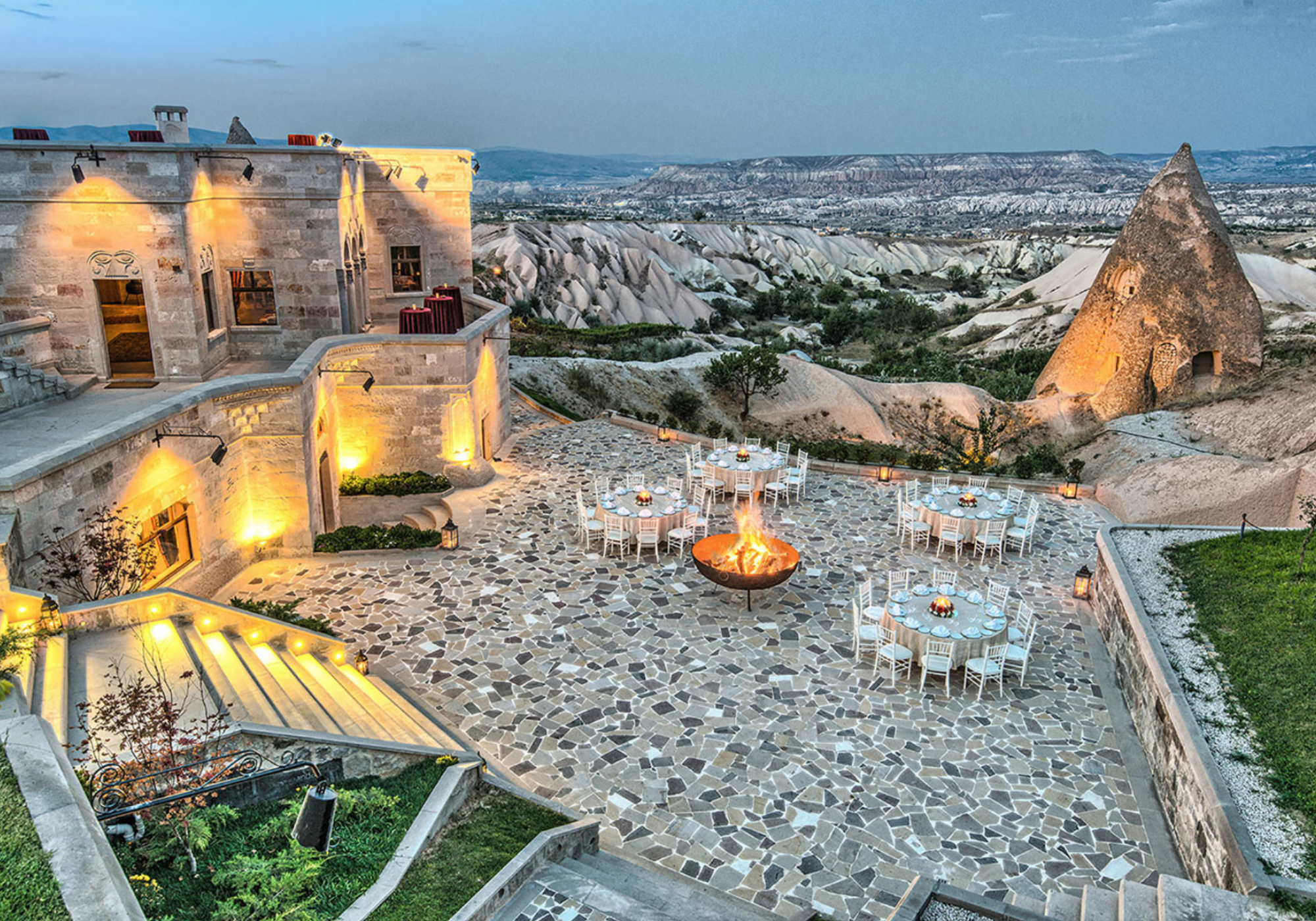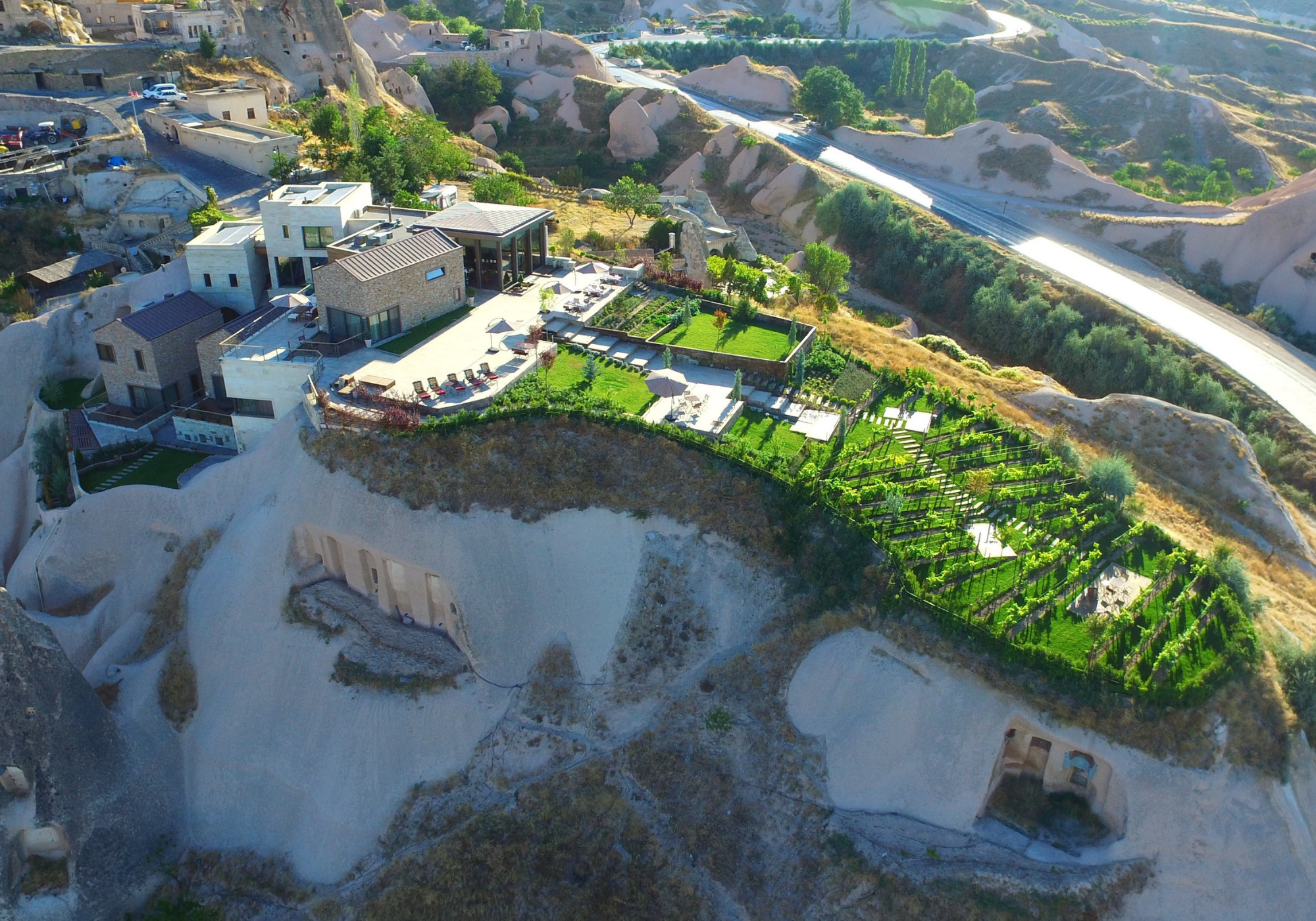 Com apenas 30 quartos e suítes, as residências em cavernas renovadas do hotel contêm a coleção do proprietário de antiguidades e artefatos otomanos, persas e romanos. Eles estão construindo um ‘poço térmico’ e há planos para aquecer o hotel usando o calor da terra. Mantendo o tema eco, toda a comida é orgânica e produzida nos jardins do hotel. A sustentabilidade é vital nesta propriedade Relais & Chateaux, com uso extensivo de energia solar. O restaurante Lil’a, os terraços, o bar e a piscina romana oferecem vistas incríveis da Capadócia.
