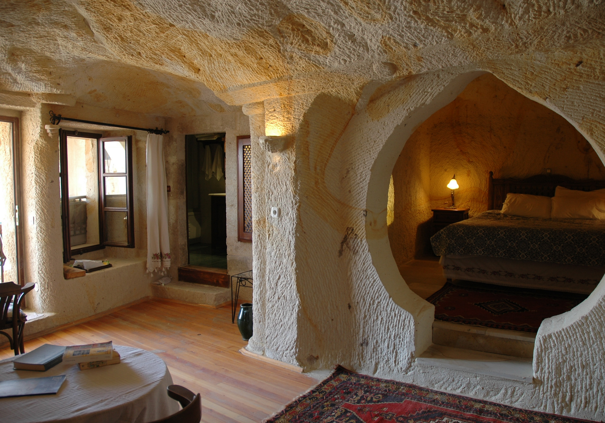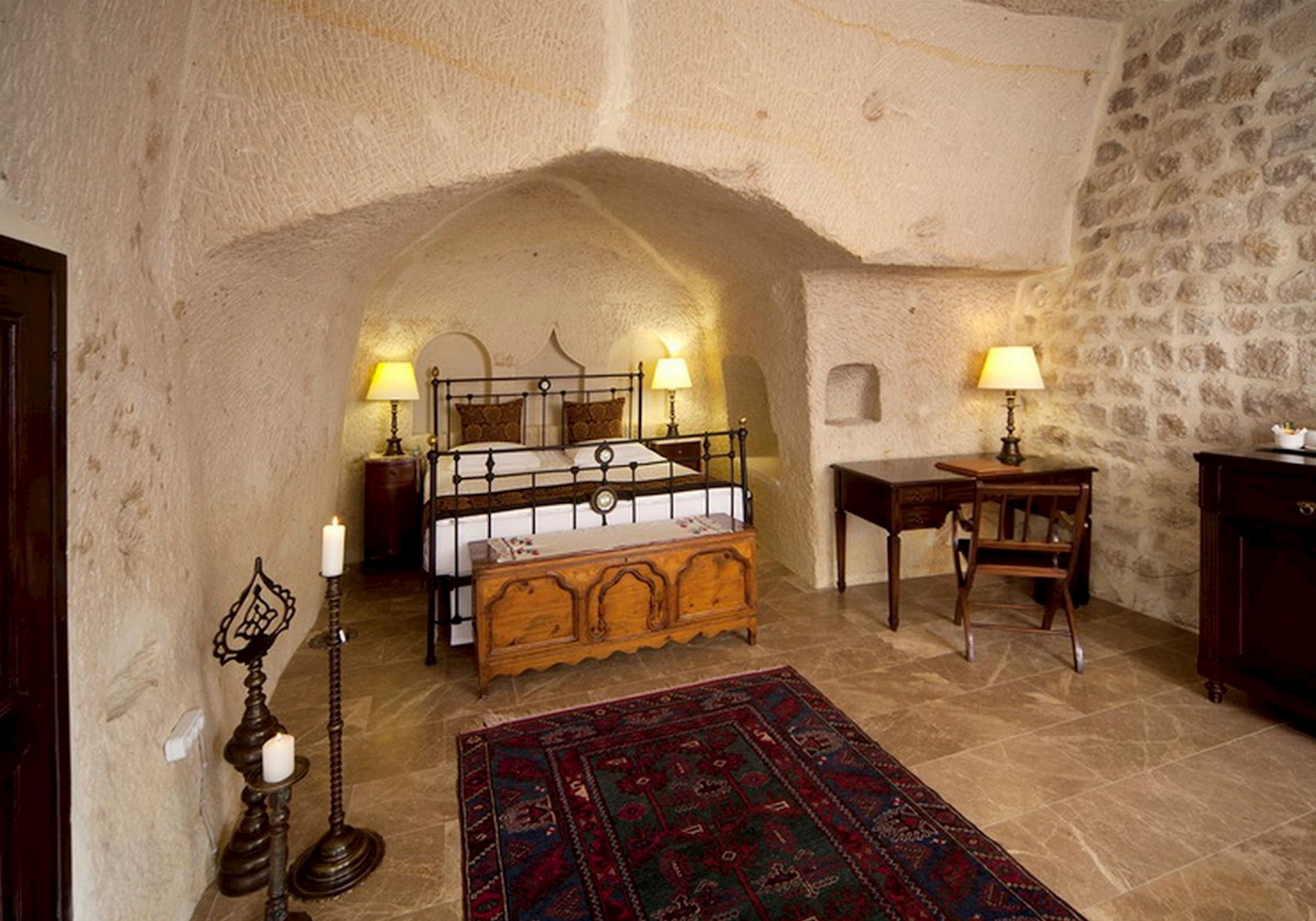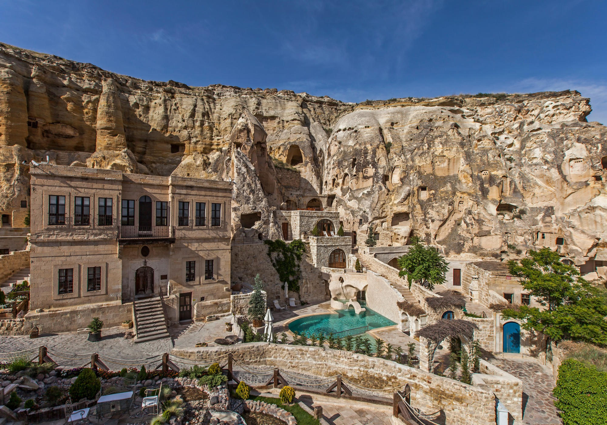 Este hotel esculpido em um penhasco oferece uma combinação de 10 casas-caverna, totalizando 120 quartos, todos datados dos séculos V e VI e cobertos por uma mansão grega do século XIX. Todos os quartos são em estilo otomano com bordados feitos à mão, cortinas de renda, móveis antigos e tapetes tradicionais. Todos os quartos têm pátios privados com vista para a Mesa Turca. No sopé do penhasco fica o saguão principal do hotel, localizado na mansão grega. O hotel também tem duas piscinas ao ar livre e um spa, enquanto o jantar à luz de velas é servido no terraço da cobertura.