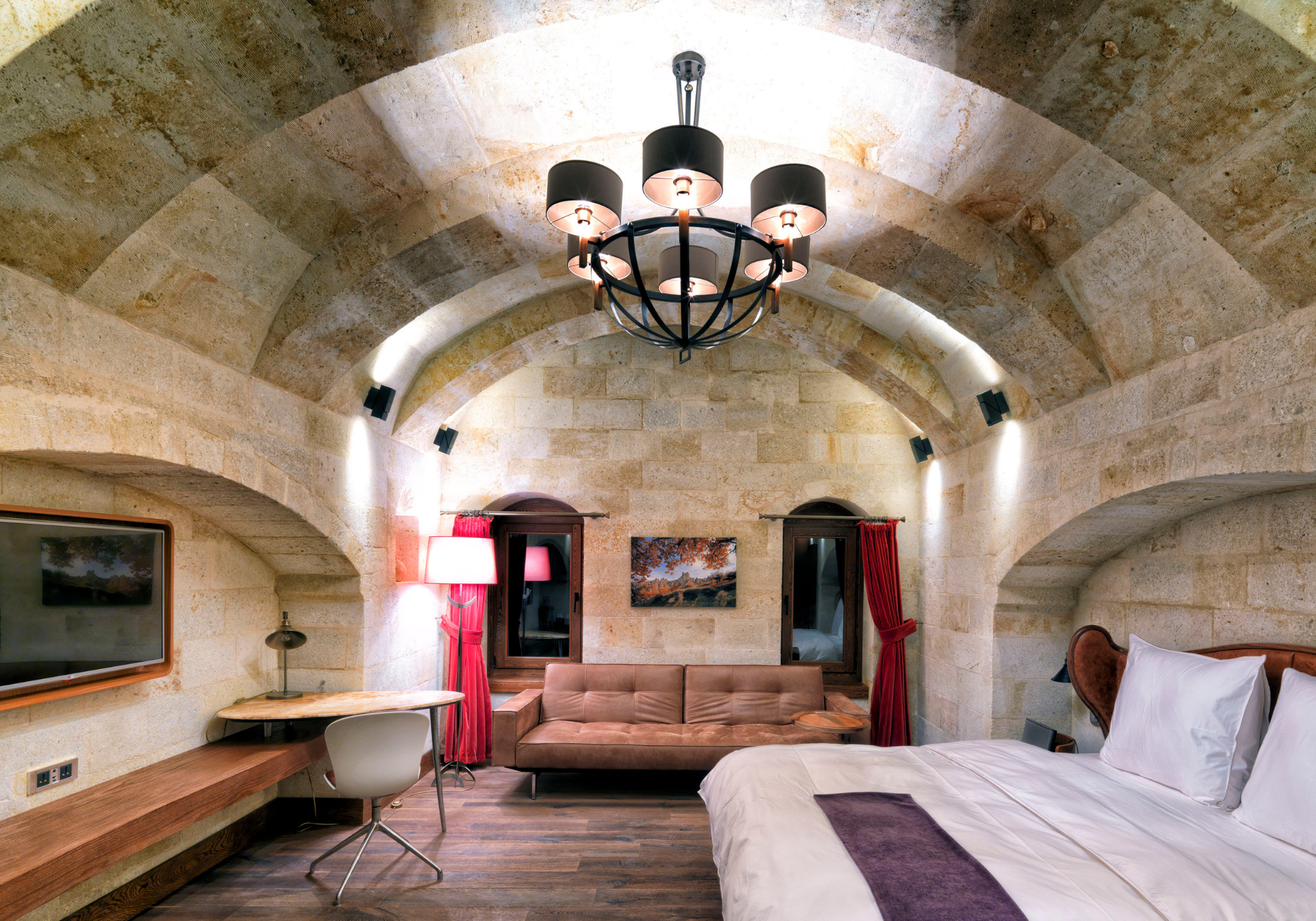Este hotel de rocha vulcânica foi restaurado com quartos cavernas e suítes localizados na colina rochosa acima da cidade de Urgup. É um dos hotéis mais exclusivos da Capadócia, com seu exterior impressionante construído na encosta de um penhasco. Cada uma das três cavernas da Capadócia oferece sete quartos e também são maiores que a maioria e não tão claustrofóbicas como muitas outras.