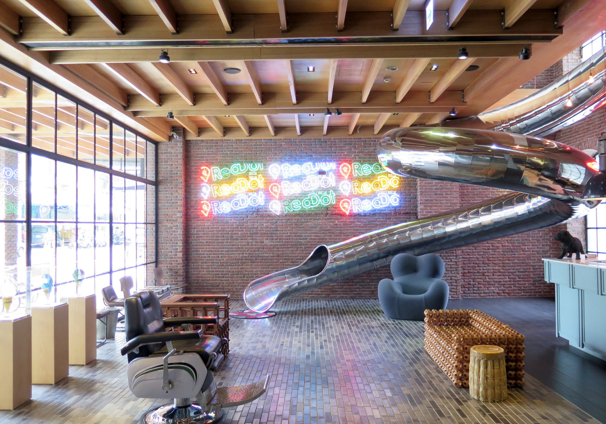 Elementos interessantes incluem um tubo de aço inoxidável em espiral descendente do segundo para o primeiro andar que imediatamente chama a atenção. A corrediça em espiral é feita de chapa de aço inoxidável 102, a corrediça de metal tem 27 metros de comprimento. Cada vez que os passageiros sentam no escorregador e descem, eles riem alto e se divertem. Imaginamos que, quando as lâminas de aço inoxidável refletem a luz neon colorida, isso se torna um túnel do tempo que traz nossas memórias de volta. Portanto, Steven Wu, o designer do slide, realmente acredita que o slide não é apenas para diversão, mas sim um objeto simbólico que inverte o tempo e o espaço.