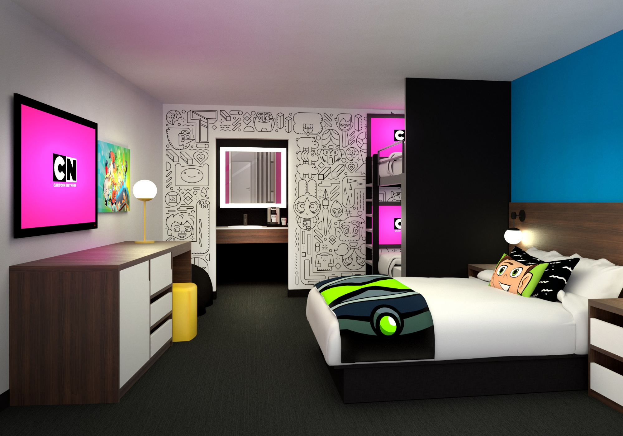 “A partir do momento em que entra no lobby do hotel, vai perceber que está num lugar diferente do que qualquer outro“. É assim que o Cartoon Network Hotel dá as boas-vindas às famílias, o primeiro da marca no mundo. Localizado no parque de diversões Palace Entertainment, em Lancaster, EUA, o hotel oferece quartos temáticos de programas como Meninas Superpoderosas, Hora de Aventura, Johnny Bravo e demais personagens do canal.