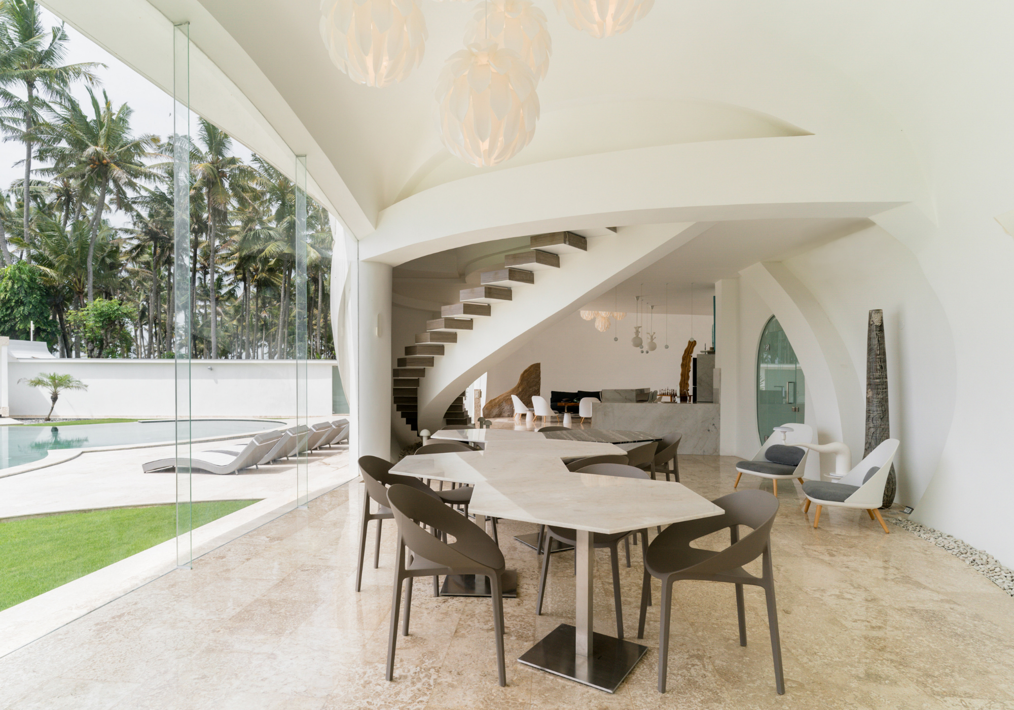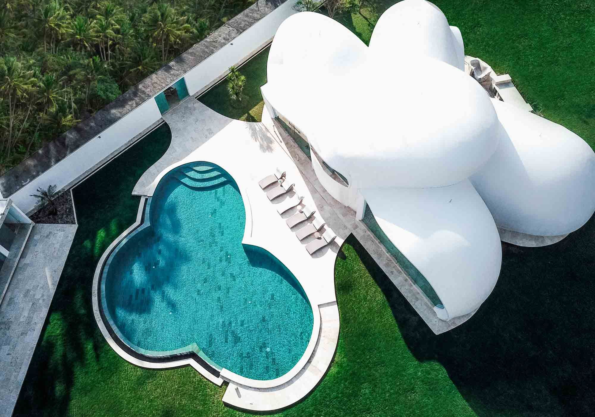 A forma geral desta villa é que se parece com uma nuvem branca, com cinco nuvens bulbosas emergindo do solo. Até mesmo o formato da piscina externa é semelhante a uma nuvem, especialmente quando você a vê de cima. E assim como a nuvem, se hospedar neste hotel é o mais confortável e tranquilo possível, já que o local é muito isolado, longe da multidão.
