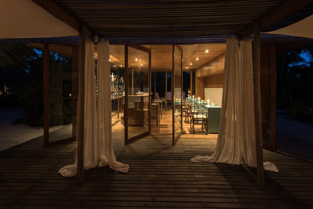 Inspiradas nas moradias dos pescadores locais, as 8 cabanas são feitas de madeira redescoberta e tabuínhas produzidas a mão de forma artesanal. Em homenagem ao arquiteto Renato Marquez e à idealizadora Renata Mellão, toda a arquitetura do Hotel conversa com o meio ambiente. As grandes janelas posicionadas em pontos opostos possibilitam a passagem da brisa do ar e combinam as cores dos ambientes com a luz natural, além de proporcionarem aos hóspedes uma visão extraordinária do local. A decoração feita com obras e trabalhos regionais valorizam o artesanato da região.
