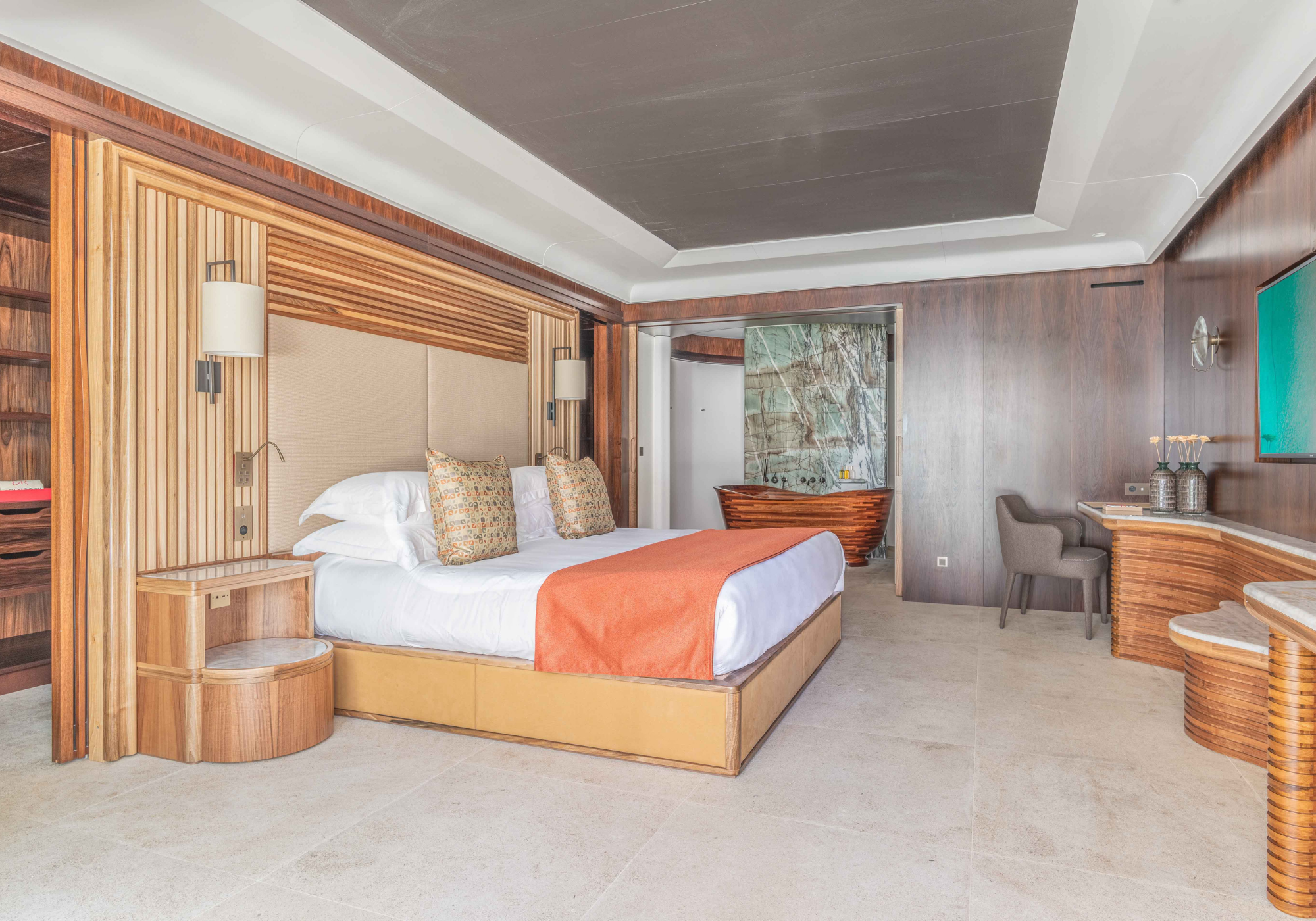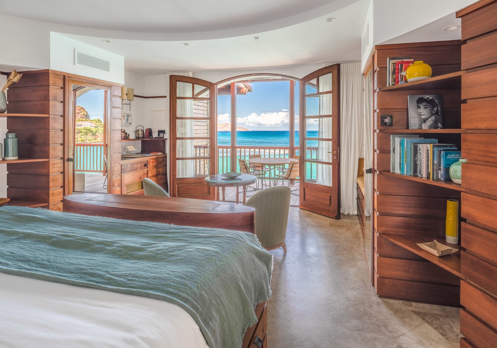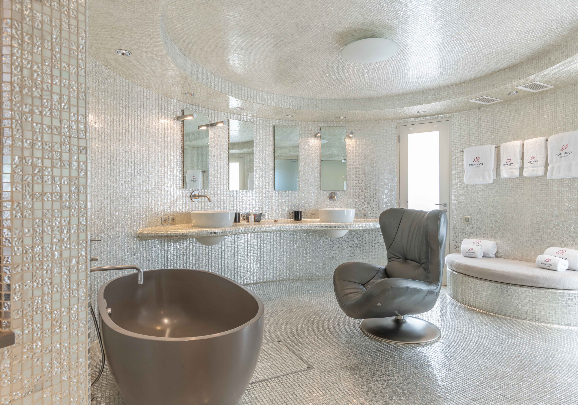 Com 34 suítes, chalés e vilas de individualidade elegante, cercados por rochas pontilhadas ou jardins verdejantes, Eden Rock é íntimo e exclusivo. Os interiores requintados são complementados com obras de arte de coleções particulares, móveis antigos restaurados e amenidades Bulgari. As suítes incluem o Howard Hughes Loft, com vista de 360 ​​graus da baía, bem como a Suíte Garbo para um toque do glamour de Hollywood dos anos 50.