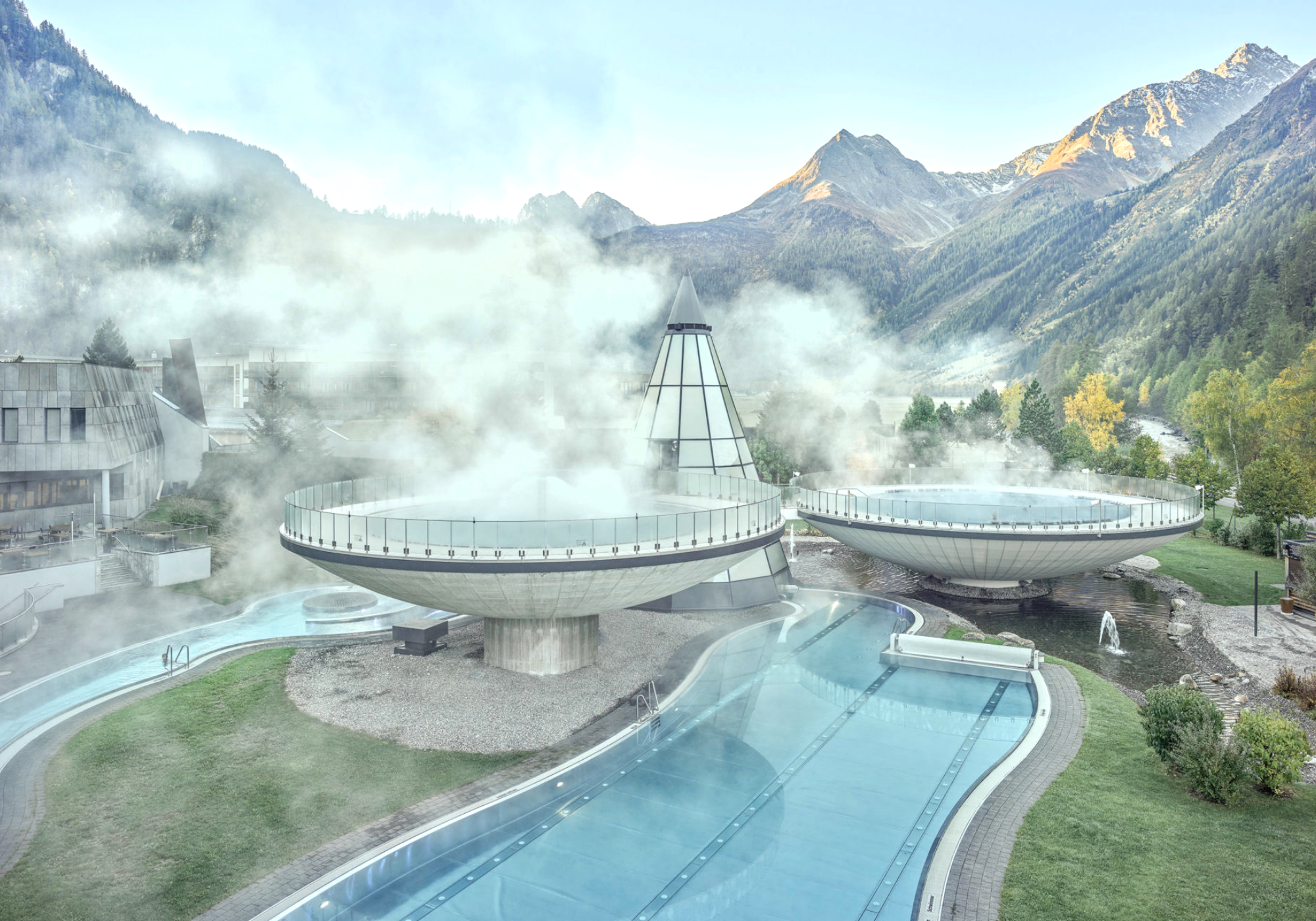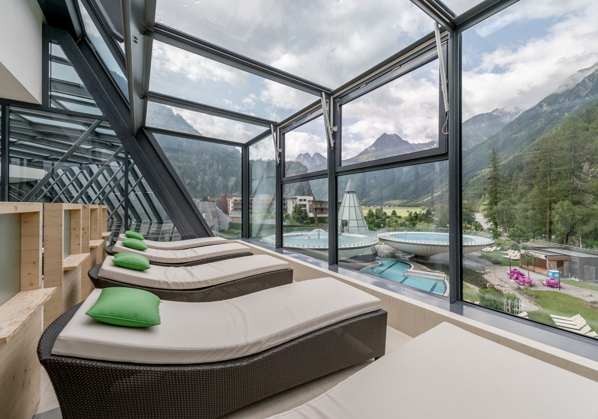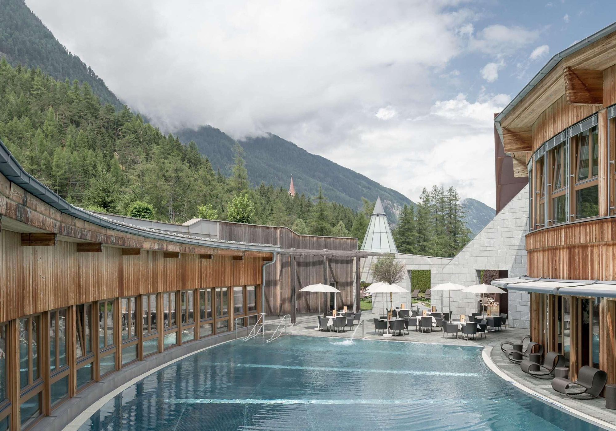 Com o seu design moderno e aberto, o Aqua Dome Tirol Therme combina harmoniosamente com o maravilhoso mundo das montanhas Ötztal, na Áustria, onde os elementos da natureza – madeira, pedra e luz – são deliberadamente integrados na arquitetura. Não apenas os turistas em busca de relaxamento apreciam o hotel, localizado em Längenfeld, os atletas profissionais também usam as condições ideais para o treinamento e a regeneração, já tendo recepcionado seleções de futebol e de esqui.