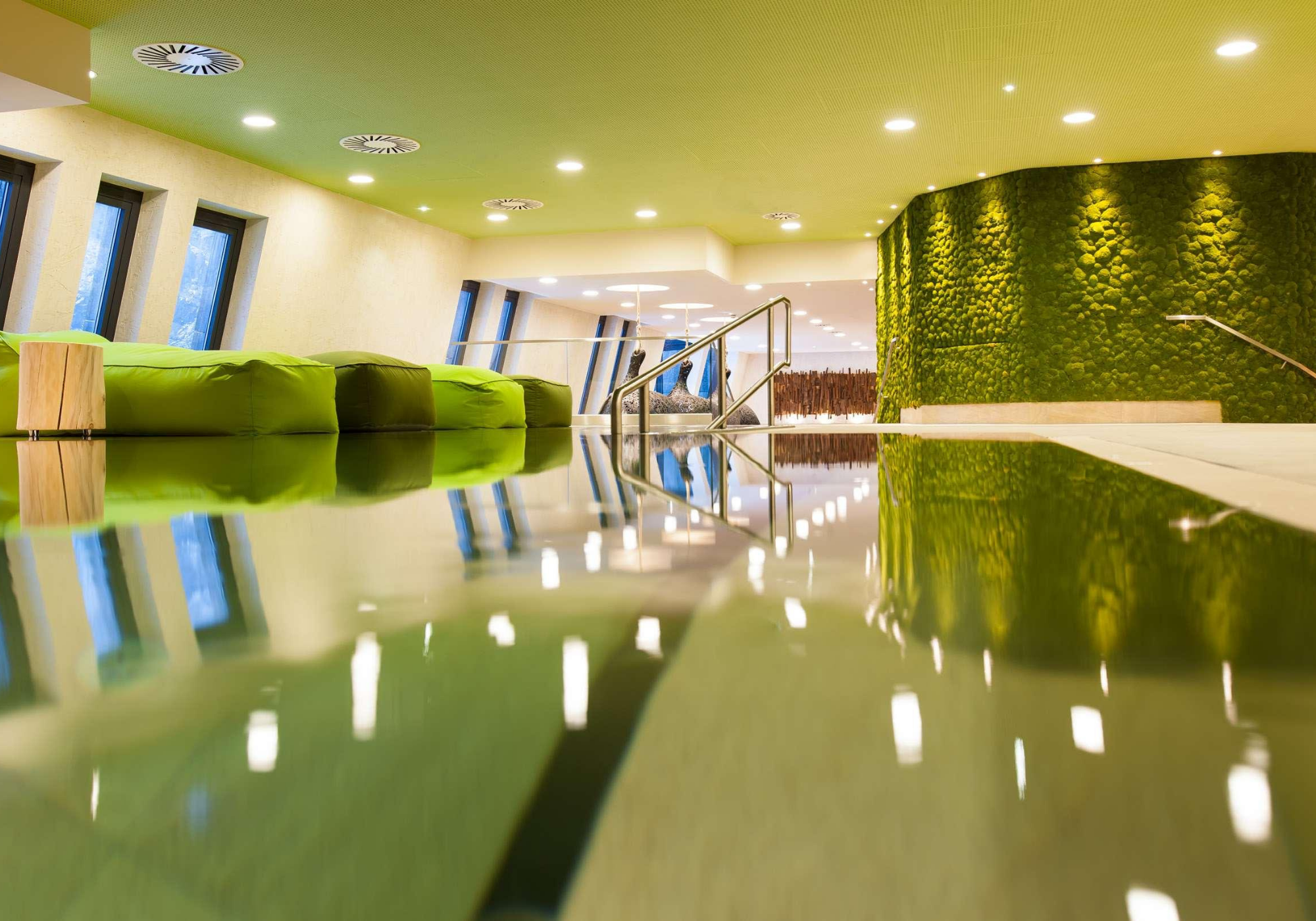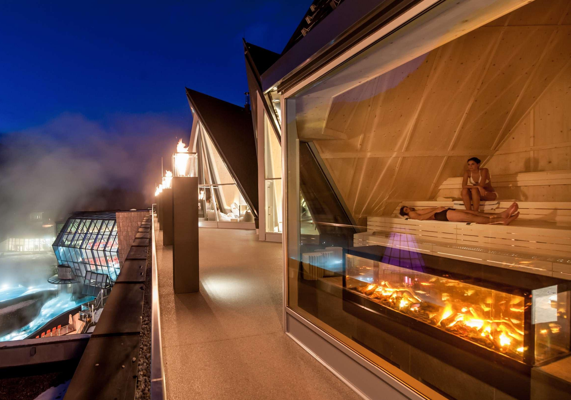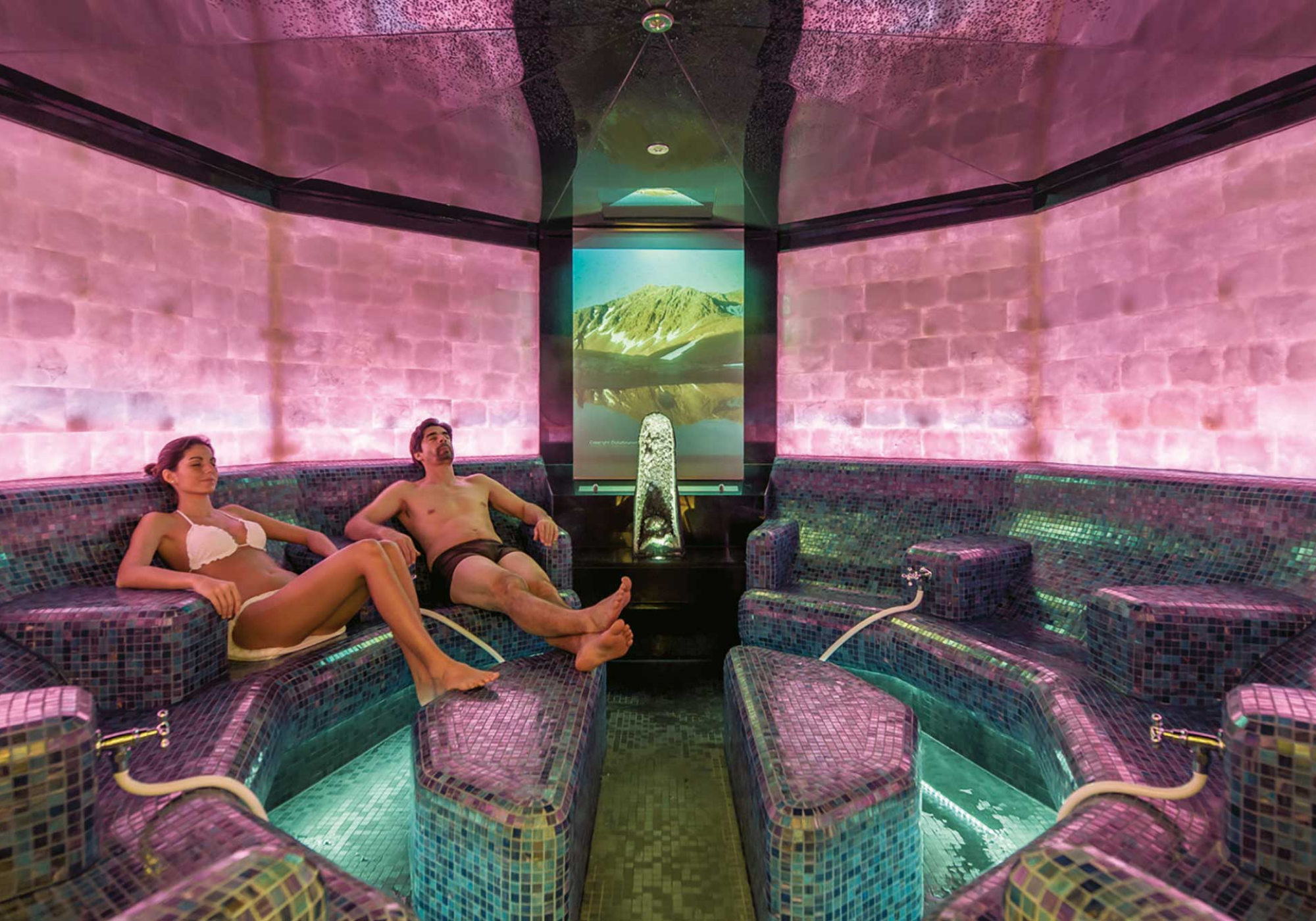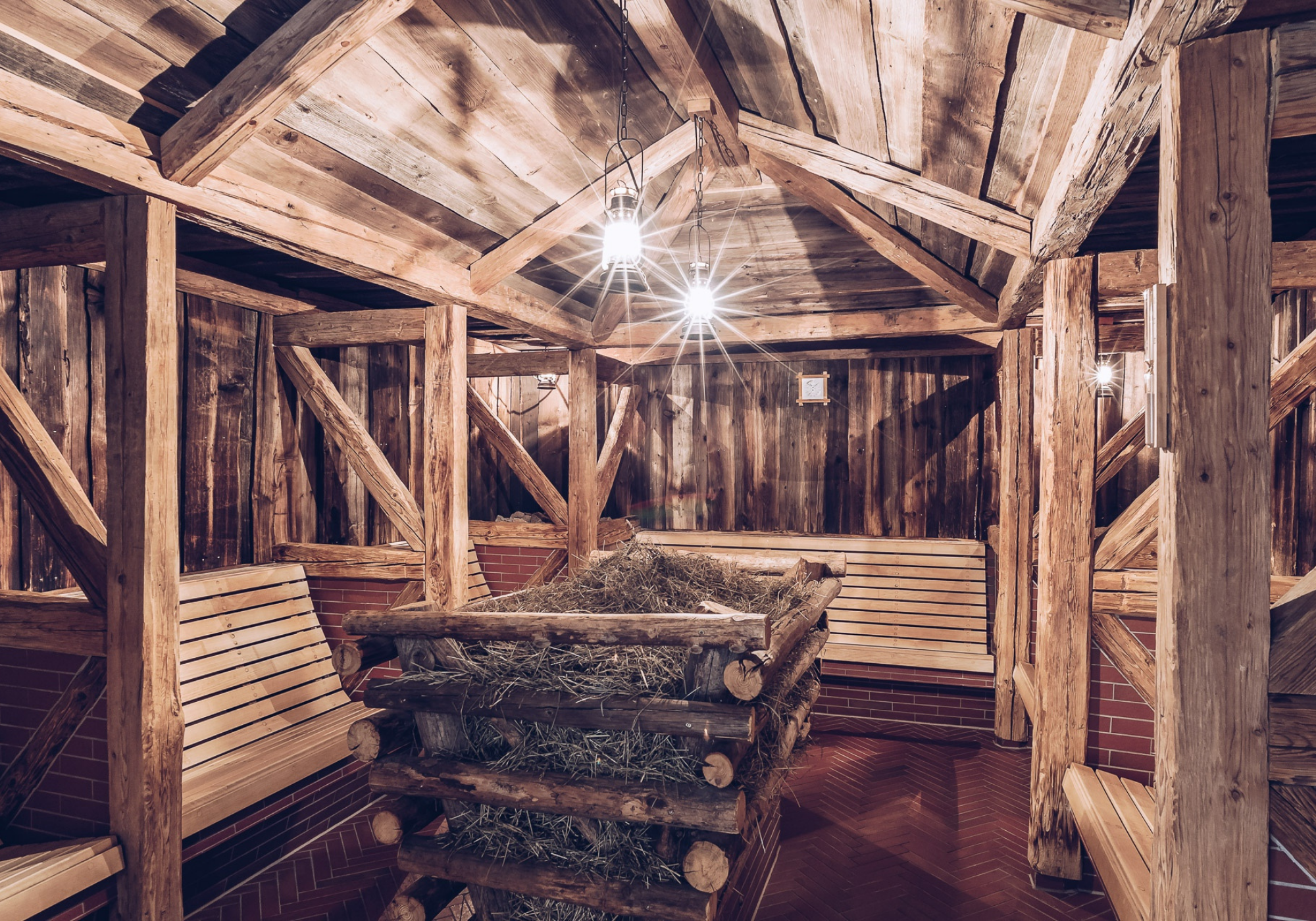 A área da sauna também é impressionante. Na sauna loft, você pode escolher entre diferentes alturas de assento e, portanto, entre diferentes faixas de temperatura. Metade da sauna da terra é construída na terra mesmo e, portanto, oferece um clima particularmente agradável. Na sauna do cânion, os shows de luz e som transformam a sessão de sauna em uma experiência sensorial, o celeiro de feno e os banhos de ervas oferecem suor que facilita a circulação em temperaturas ligeiramente mais baixas. No banho de vapor de salmoura, o alto teor de sal tem um efeito benéfico no trato respiratório. E, finalmente, uma sessão na cúpula de vapor suaviza a pele, desintoxica e regenera maravilhosamente as vias respiratórias.