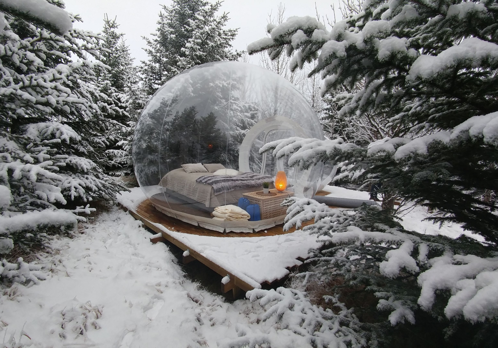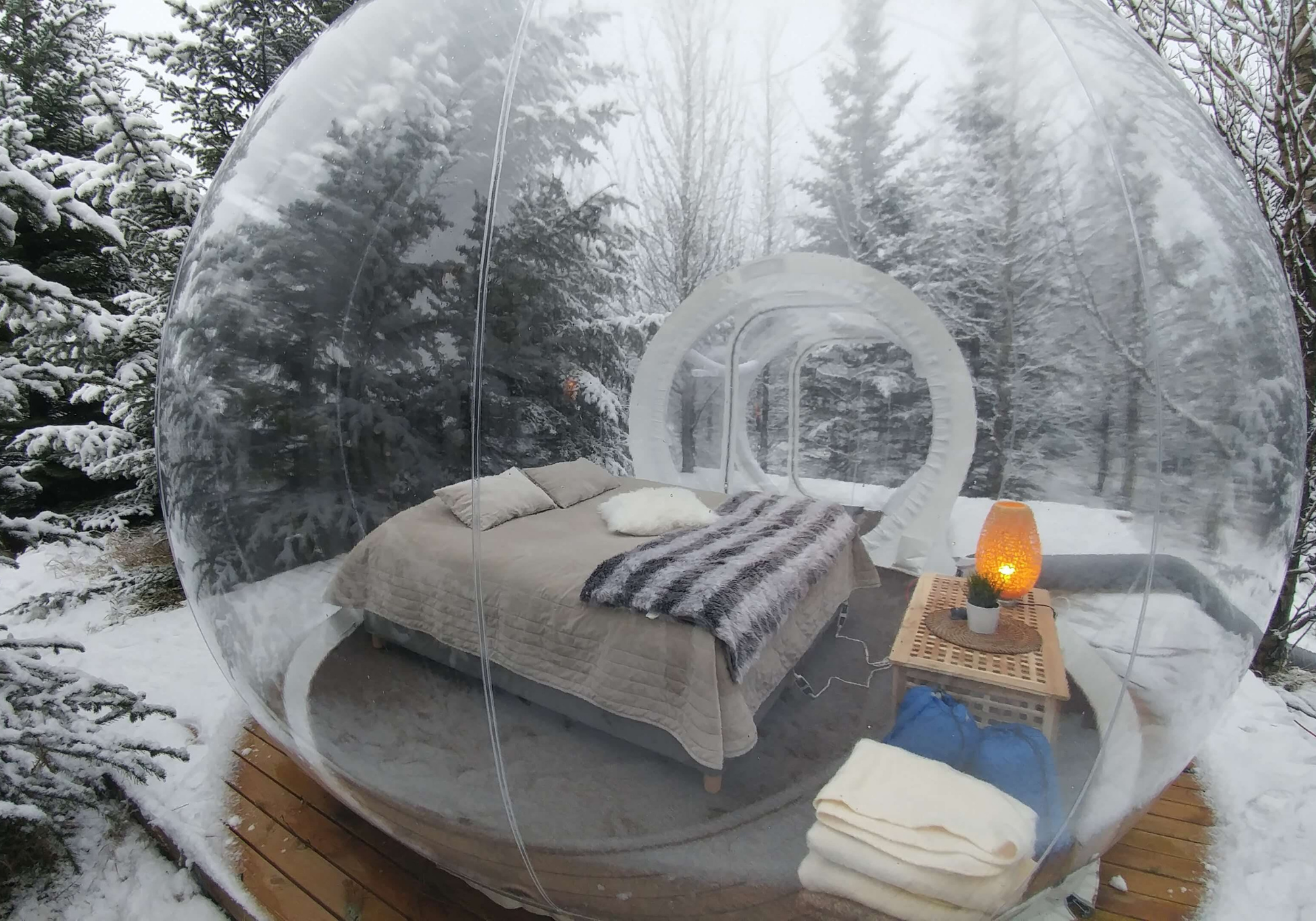 Para aqueles que se preocupam com a privacidade – afinal, essas bolhas são completamente transparentes – não tema. Cada bolha tem total privacidade e é isolada das outras. Você não conseguirá ver ou ouvir mais ninguém. É exatamente como dormir ao ar livre no meio de uma floresta verdejante, exceto que você não precisa lidar com coisas desagradáveis, como falta de aquecimento e dormir no chão. Por dentro, seu quarto para pernoitar é perfeitamente simples, com cama de casal, lâmpadas, aquecedor e um local para conectar seu telefone. Você precisará de toda a bateria que puder para as muitas, muitas fotos que vai tirar.