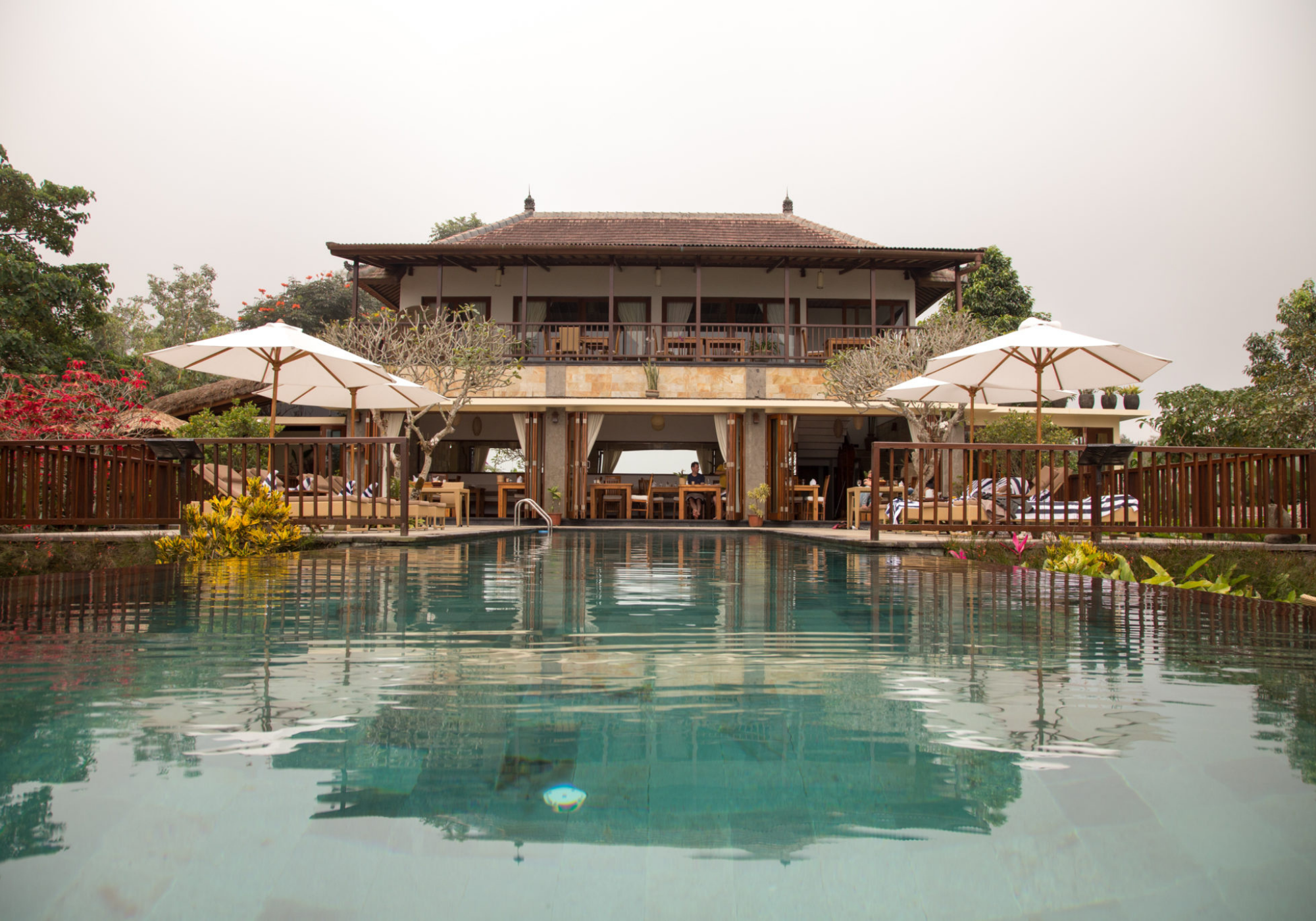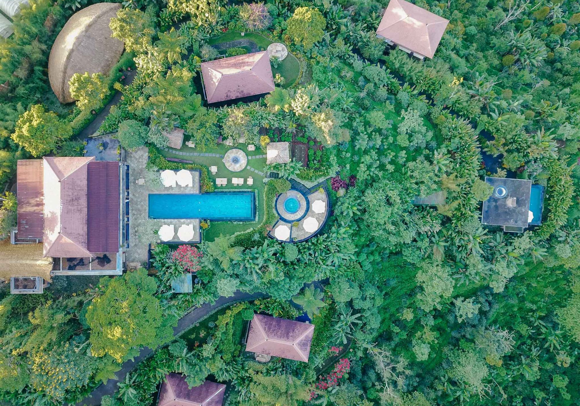 Com seus telhados vermelhos e paredes de pedra, o hotel parece – e se sente – como uma casa isolada e confortável. O hotel foi desenhado pelo conhecido arquitecto balinês Popo Danes, que combinou cuidadosamente o estilo balinês com elementos modernos para criar uma propriedade que é ao mesmo tempo confortável e exótica. O prédio principal, de dois andares e que abriga a recepção, a biblioteca e o restaurante, é o centro da propriedade e tem uma bela piscina infinita que se estende até os distantes vulcões de Java. A vista daqui é soberba.