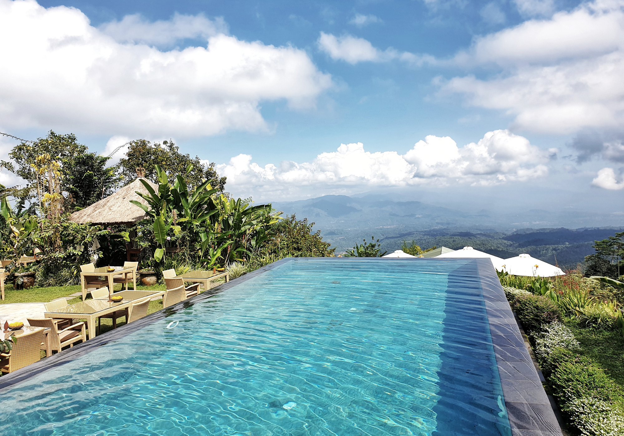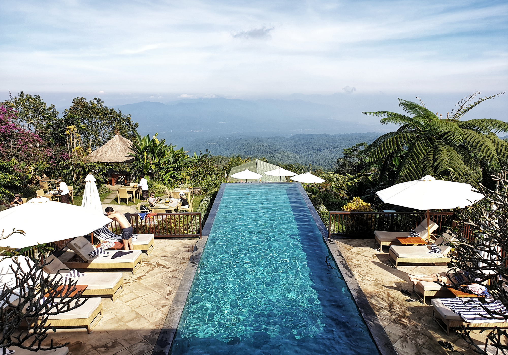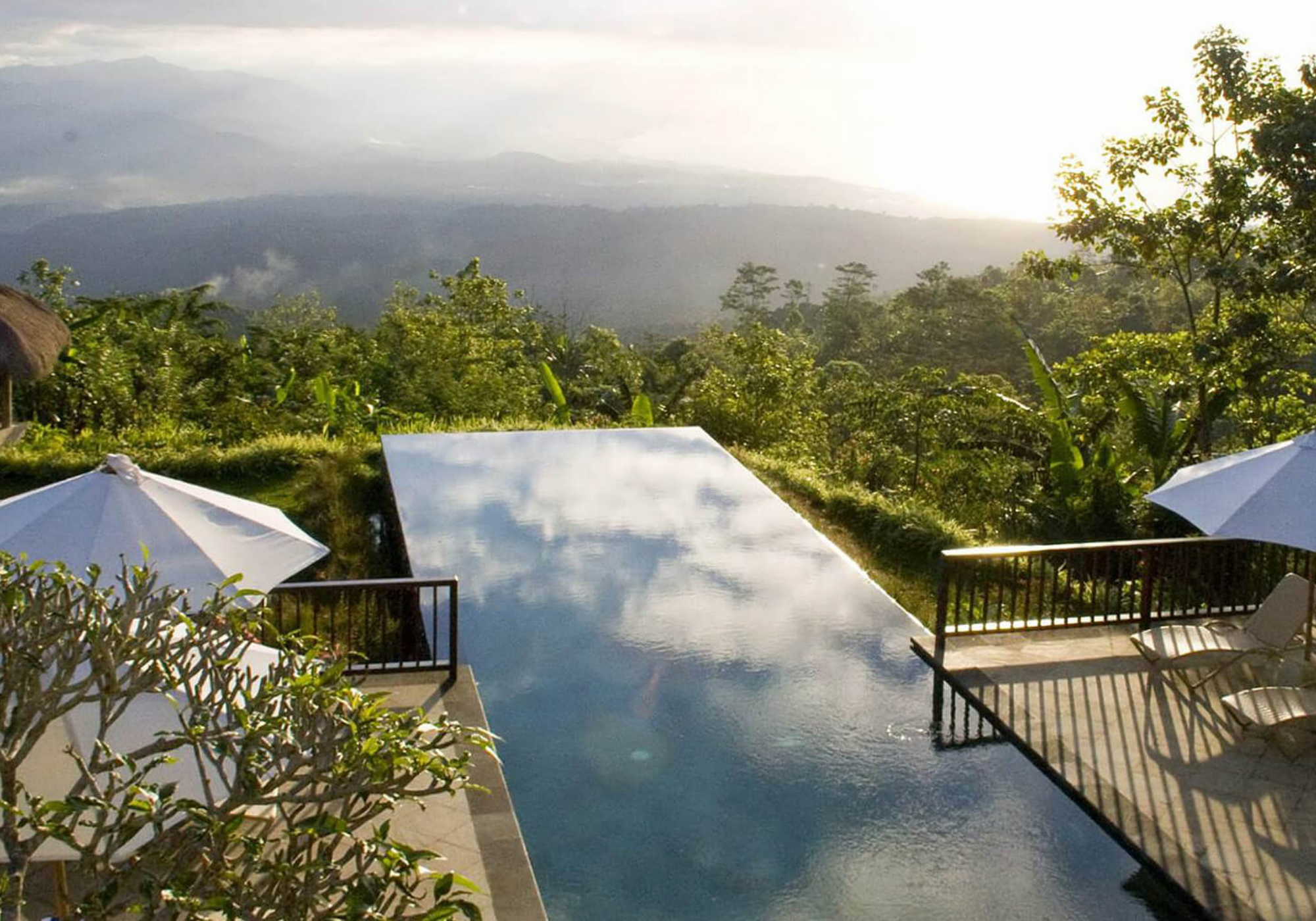 Eleita uma das melhores piscinas infinitas do mundo, a piscina do Munduk Moding Plantation é única em sua posição nas montanhas do norte de Bali. As vistas da plantação de café do resort e da costa norte de Bali são absolutamente deslumbrantes. Cercas na borda das áreas de azulejos garantem que os mais pequenos não desapareçam da borda, para que você possa relaxar facilmente e apreciar a vista. Esta também é uma base incrível para explorar as belas montanhas de Bali com suas cachoeiras, lagos de crateras vulcânicas e selva exuberante.