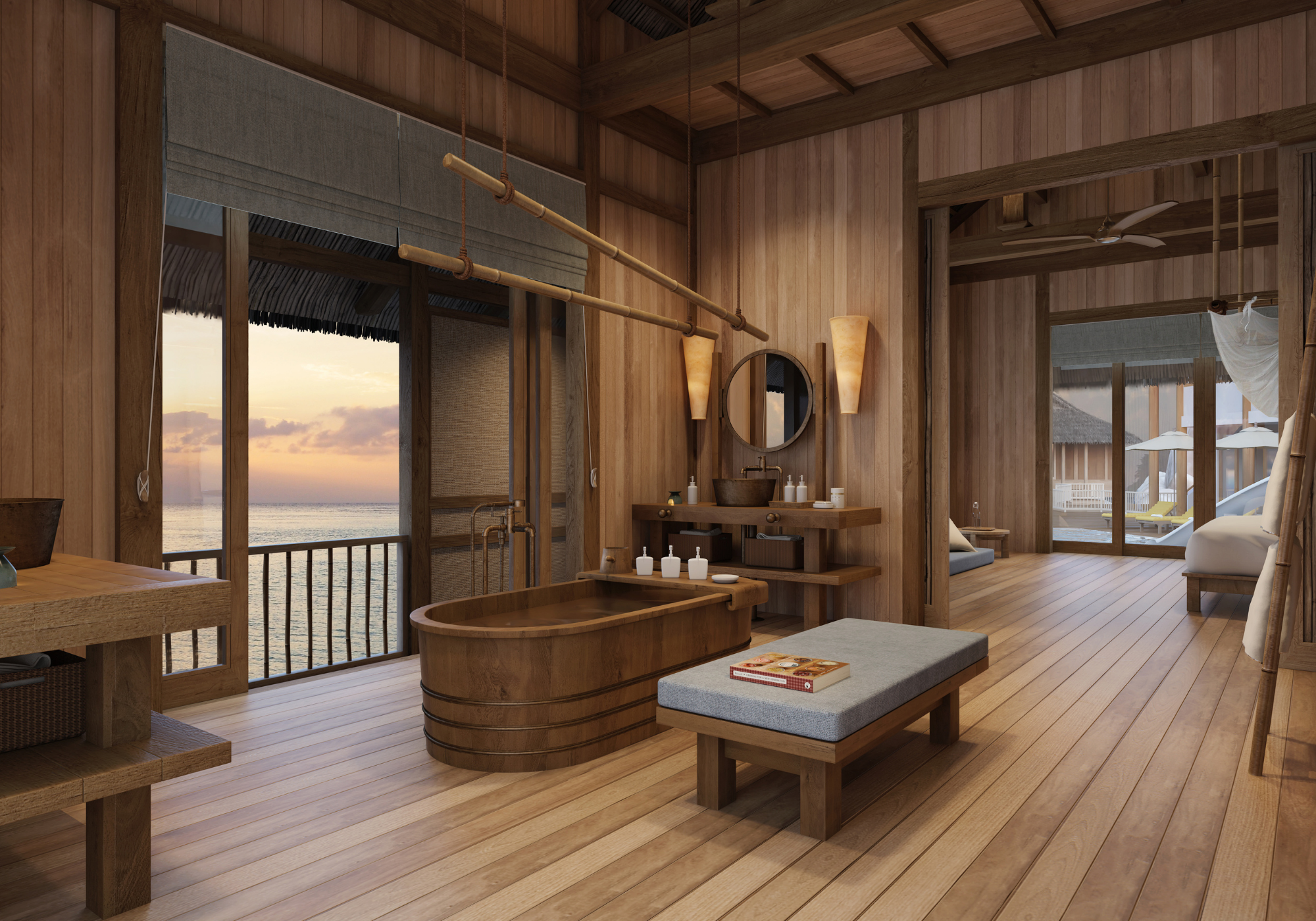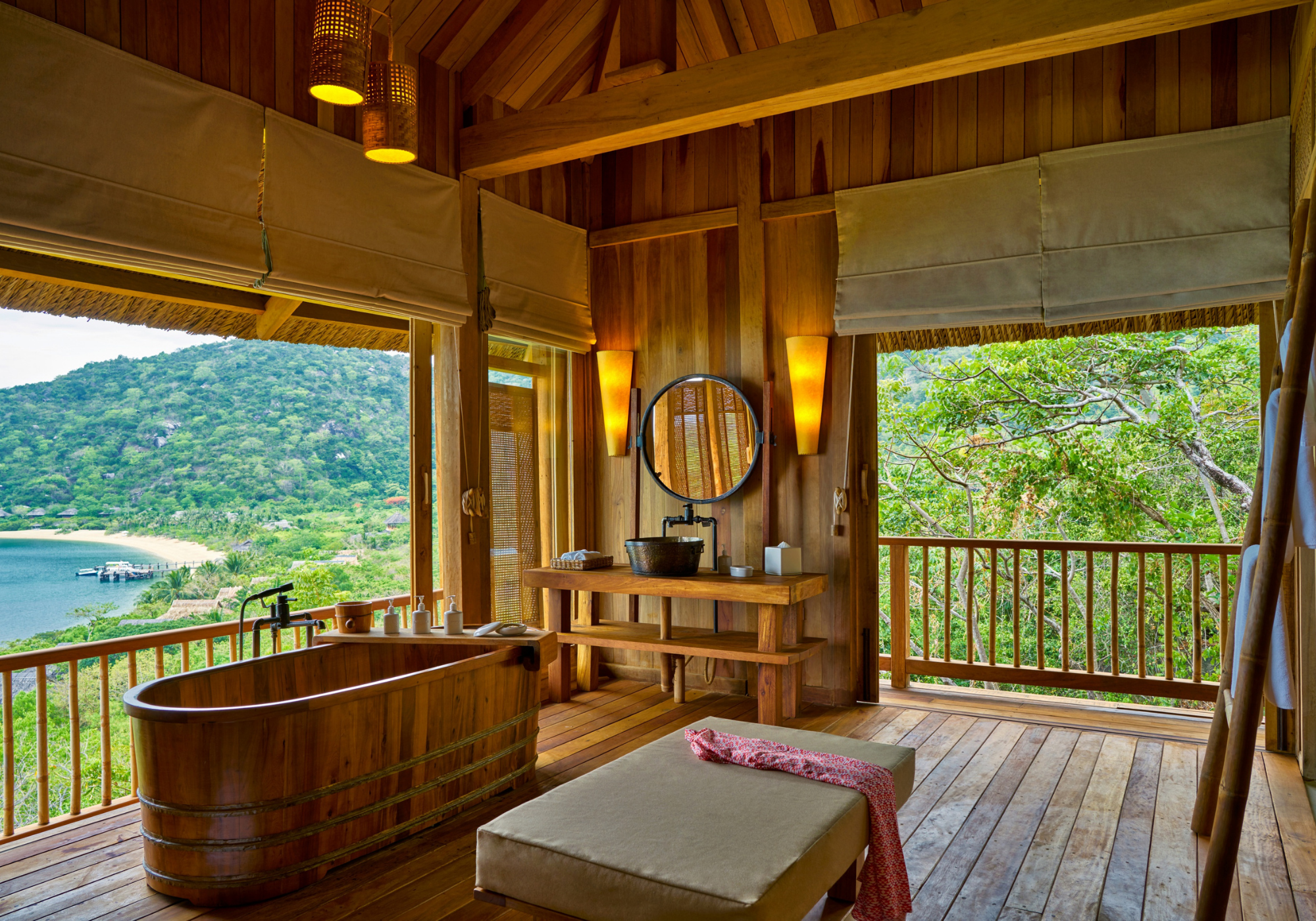 A banheira de madeira do Six Senses Ninh Van Bay fica em uma baía belíssima em uma península de mesmo nome com vista para o mar turquesa do Leste do Vietnã. Os hóspedes podem passar horas admirando a beleza mística da praia de areia branca e as montanhas altas ao longe, ou simplesmente sentar e ouvir as ondas quebrando contra a costa ao fundo. Para finalizar sua imersão serena, os viajantes podem mimar-se com um jantar de seis pratos e vinhos combinados. Essa é uma maneira perfeita de terminar o dia.
