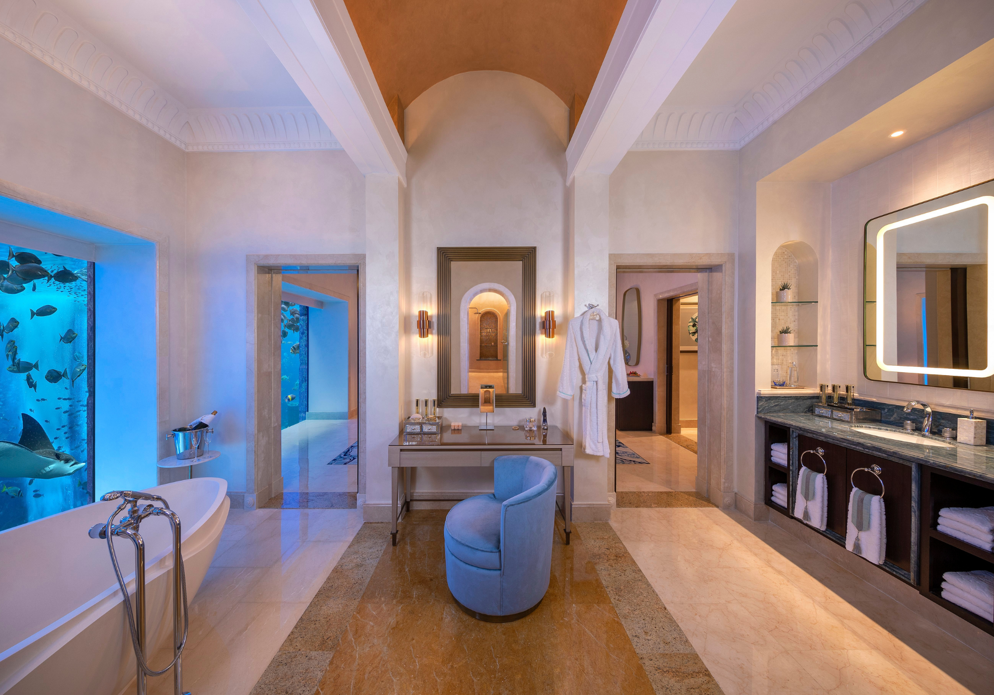 A banheira espetacularmente grande do Atlantis The Palm, em Dubai, fará com que todos os hóspedes se sintam como se estivessem nadando embaixo d’água, com vistas quase do chão ao teto do maior aquário dos Emirados Árabes Unidos, que abriga 65 mil animais marinhos. Durante a sua estadia, os viajantes podem sentar-se, estourar uma garrafa de champanhe, desfrutar do serviço de mordomo dedicado 24 horas e ficar hipnotizados pelo movimento calmante dos peixes.