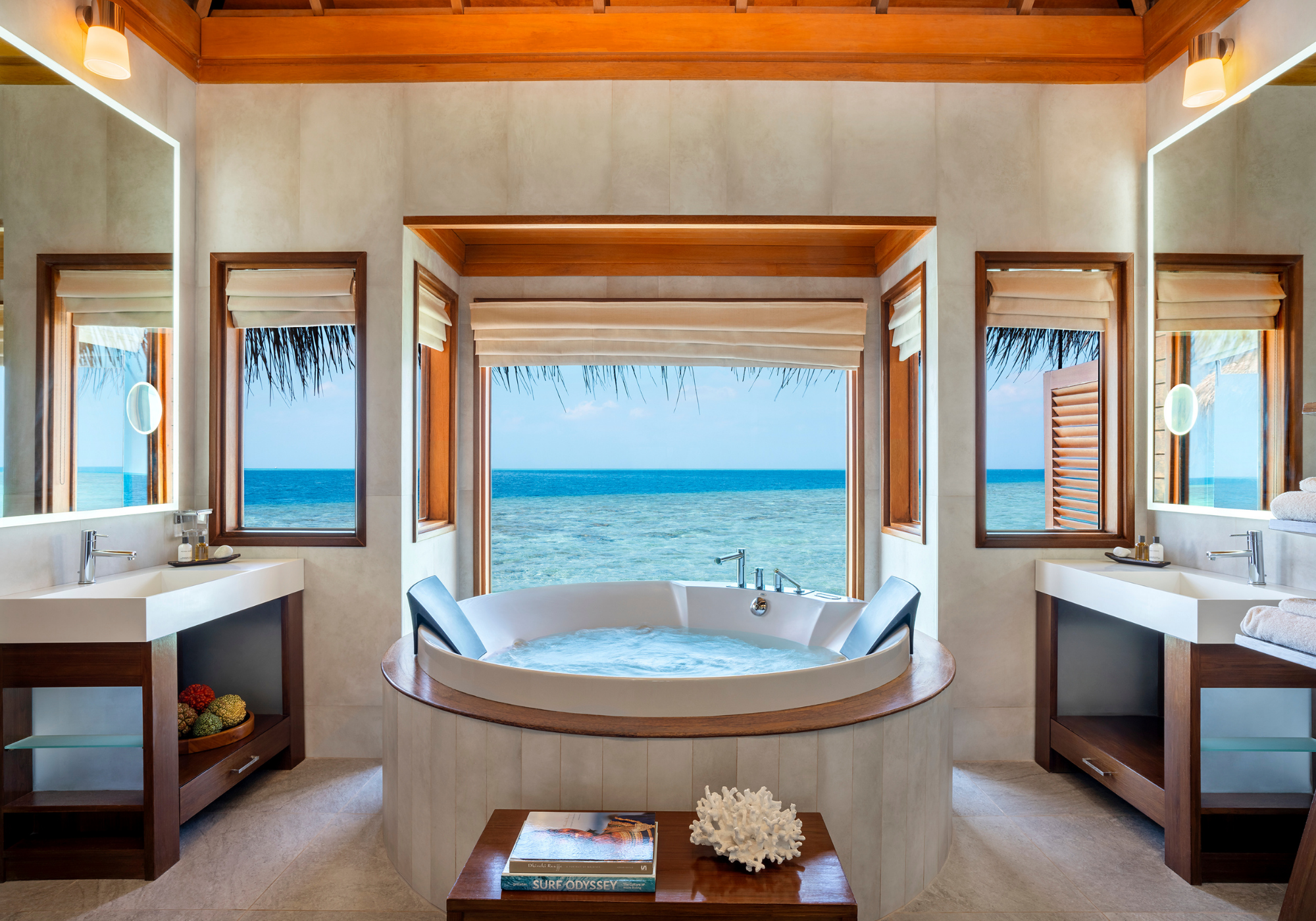 Localizada em uma ilha particular, onde é possível chegar a apenas 20 minutos de lancha, a banheira de hidromassagem em Huvafen Fushi, nas Maldivas, oferece muita privacidade e tranquilidade, sendo ideal para dias românticos e relaxantes. Essa banheira é circular e está posicionada no centro do bangalô, proporcionando um panorama do Oceano Índico, para que os hóspedes possam passar o tempo em pura serenidade.