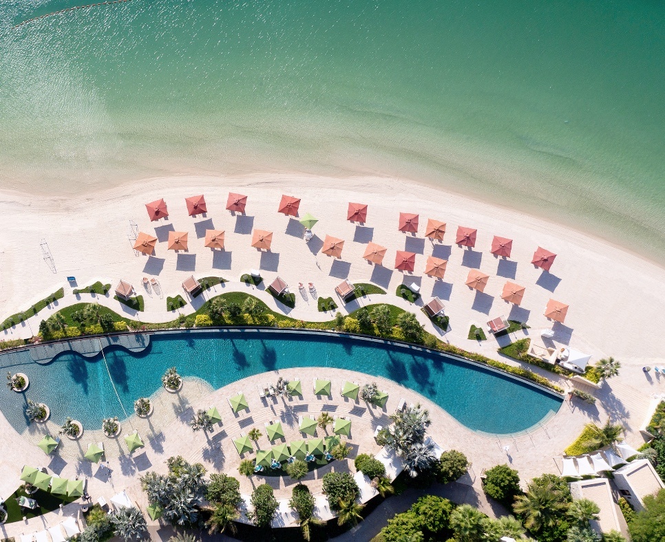 Curvando-se ao longo da costa sul ensolarada da ilha particular, a extensão de 160 metros de areia branca e imaculada é o refúgio ideal para toda a família. Os pequenos hóspedes podem deslizar, mergulhar e nadar no parque aquático infantil espetacular, The Dhow, com diversão aquática de última geração, de sete toboáguas escorregadios a um balde basculante de 1200 litros.