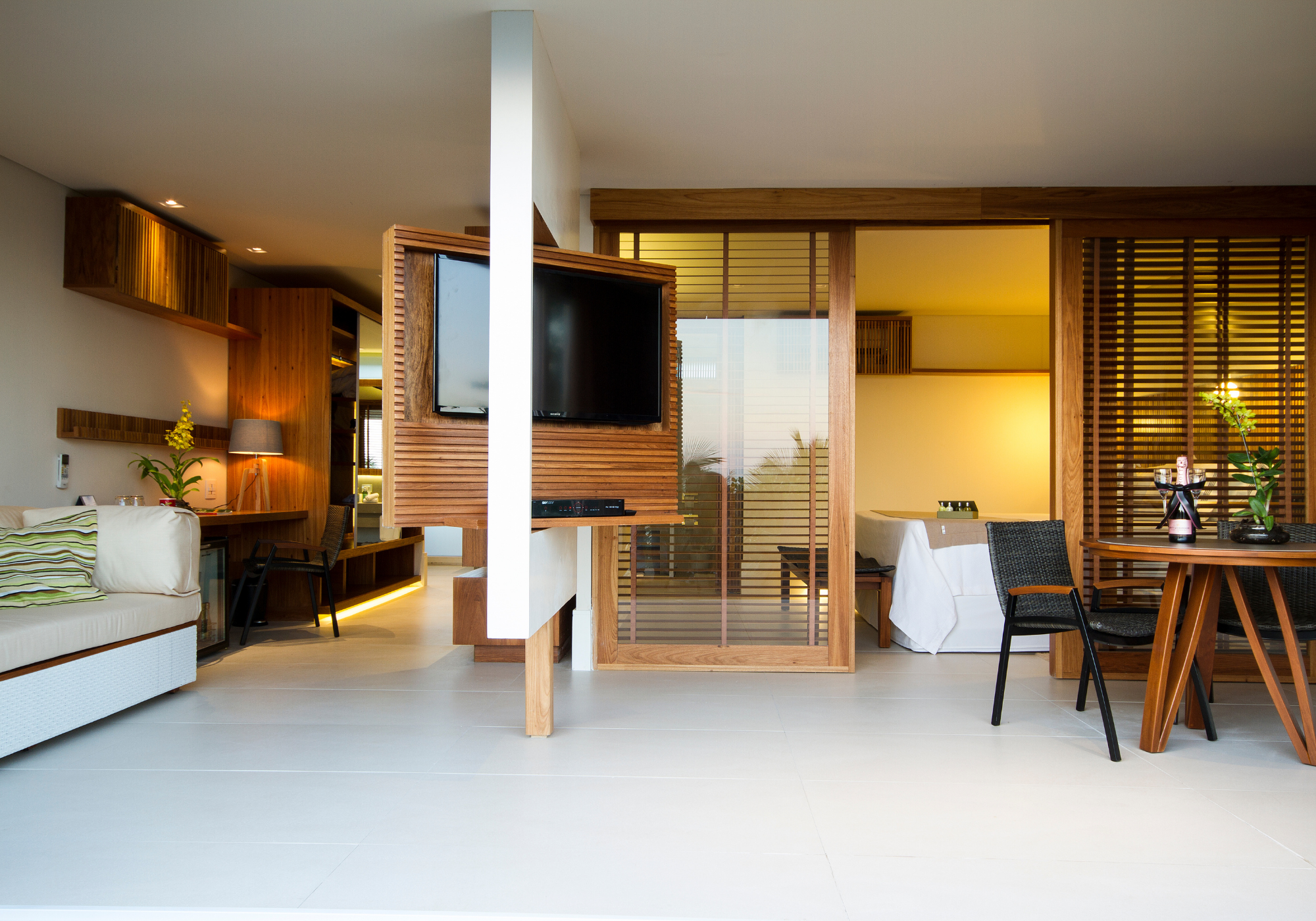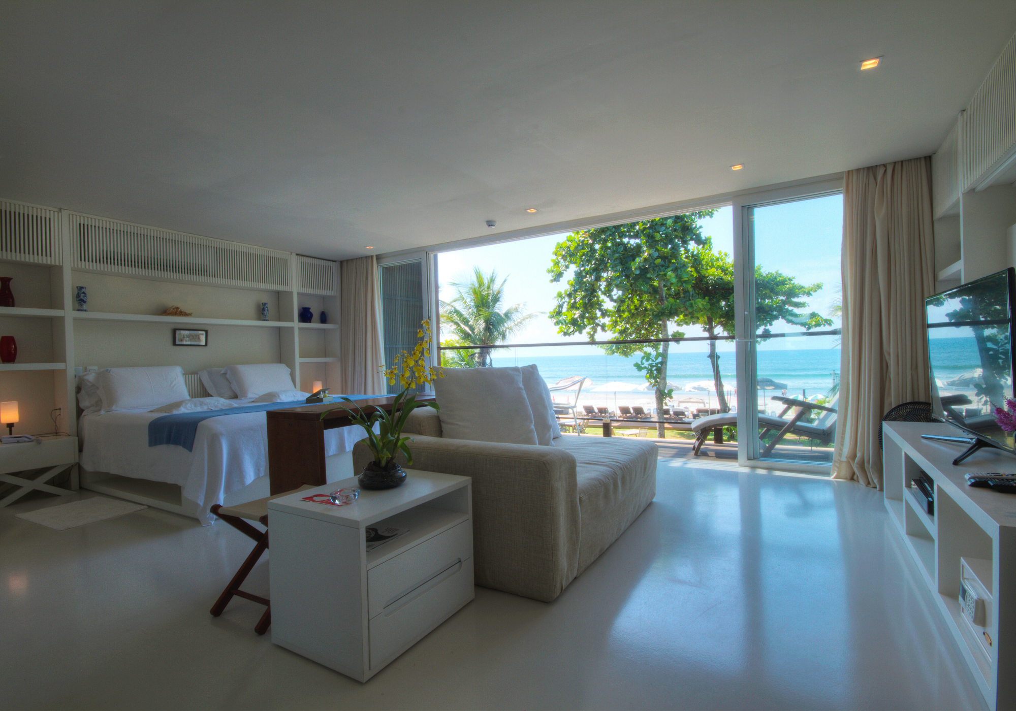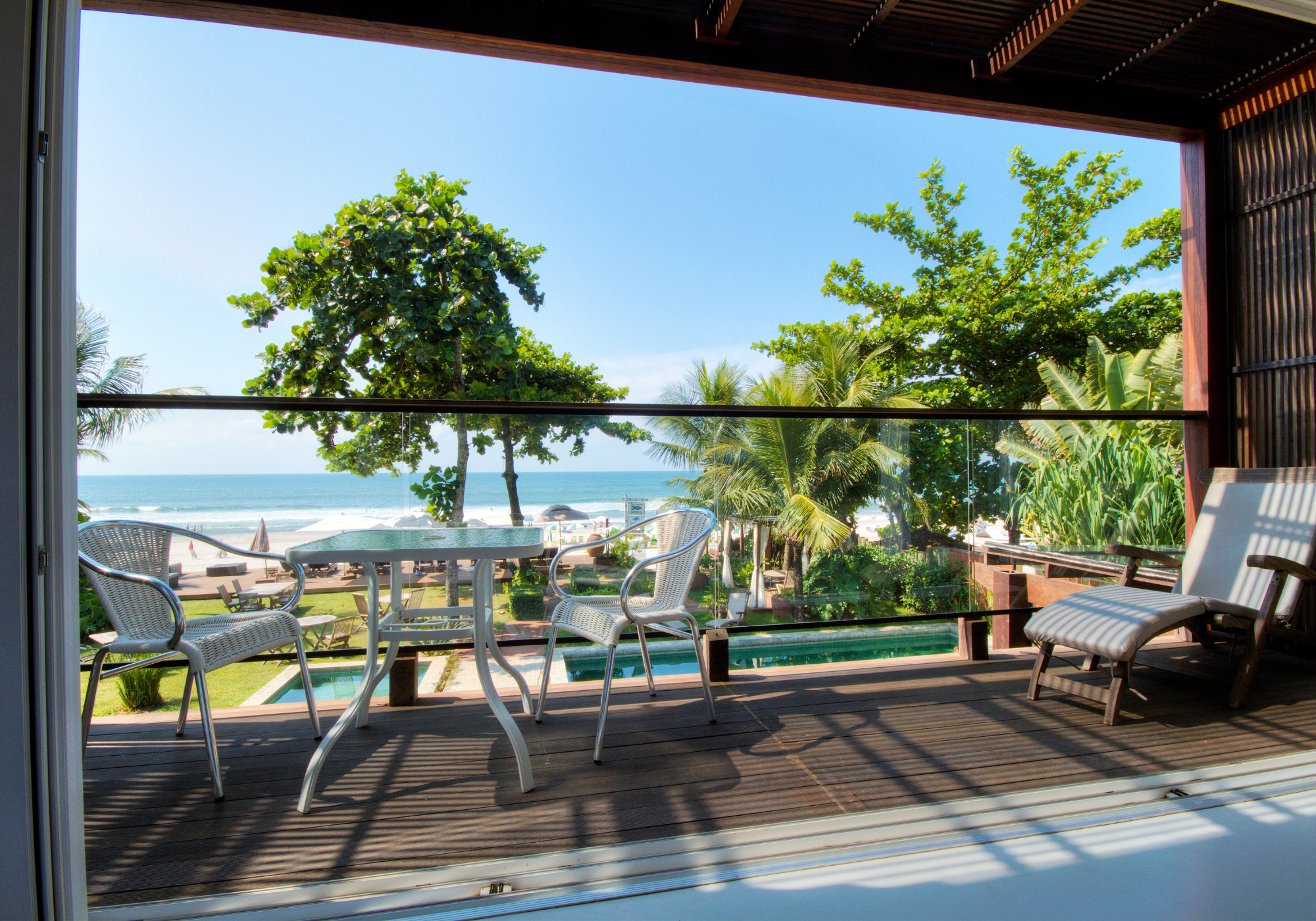 As suítes estão espalhadas por dois andares da sede, que é toda envidraçada, o que dá um clima de casa de praia em vez de hotel. À frente das suítes estão duas piscinas (uma delas é uma jacuzzi aquecida), espreguiçadeiras em um deque diante da praia e um gazebo na beira da piscina onde dá para fazer massagem ouvindo o barulho do mar. A praia, aliás, nunca fica cheia, então é mais um motivo para curtir o dia a dois, sem nenhuma aglomeração na areia.