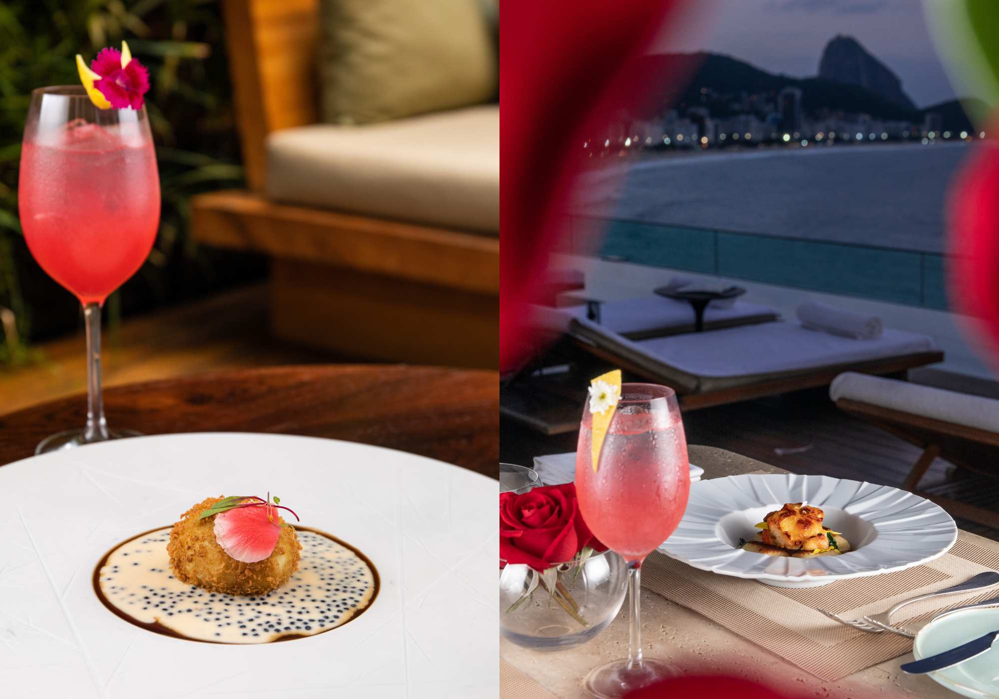 Já o jantar no Rooftop é uma experiência inesquecível de frente para o mar, com poucos lugares, uma opção mais exclusiva para os amantes comemorarem a ocasião. O cardápio elaborado para esta ocasião especial tem pratos leves e sofisticados, incluindo couvert, amouse buse do Chef, uma opção de entrada, três de prato principal e duas sobremesas, harmonizado com vinhos da casa. Um welcome drink exclusivo para os casais foi criado pela equipe do bar, o elegante La Vien Rose, um coquetel equilibrado, frutado e com frescor. Destaque para a sobremesa da talentosa e criativa Chef Pâtissier Luisa Jungblut: As Rosas, uma degustação de chocolates, com uma apresentação impecável, com bombons de hibisco, lichia e pimenta rosa e Bombom ruby, framboesa, balsâmico e iogurte, dentro de rosas em uma caixa.