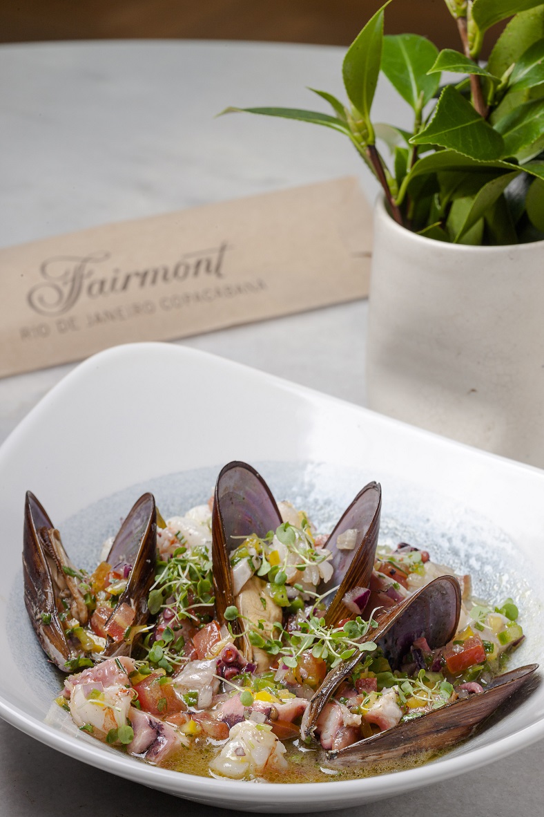 Instalado no sexto andar do Fairmont Rio de Janeiro Copacabana, o Marine Restô é um convite para experimentar e compartilhar sabores, cores e formas do Rio. A descontraída elegância da cidade está presente no ambiente com os tons do mar, na atmosfera leve e casual e, sobretudo, nos pratos criados também pelo chef Carlos Cordeiro – não por acaso também carioca – para o restaurante do primeiro hotel da marca de luxo da Accor na América do Sul. Com dois fornos a carvão vegetal Josper como protagonistas da cozinha aberta para o salão, o Marine Restô oferece uma experiência gastronômica apurada e única, com sabor e bossa locais. “Todos os elementos do nosso cardápio circulam ao redor da brasa, a técnica mais antiga de cocção, cuidando com o mesmo amor de pescados, carnes e legumes grelhados”, conta Cordeiro, que segue o conceito da rede elaborado pelo chef-executivo francês Jérôme Dardillac.