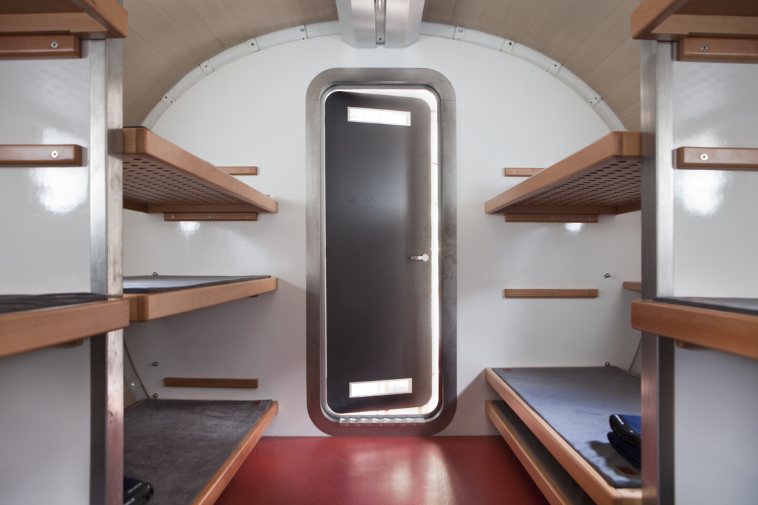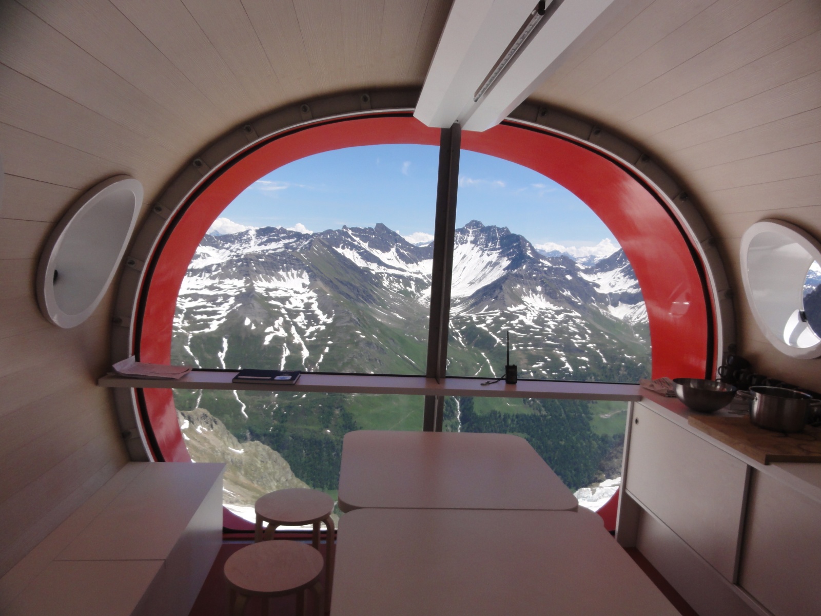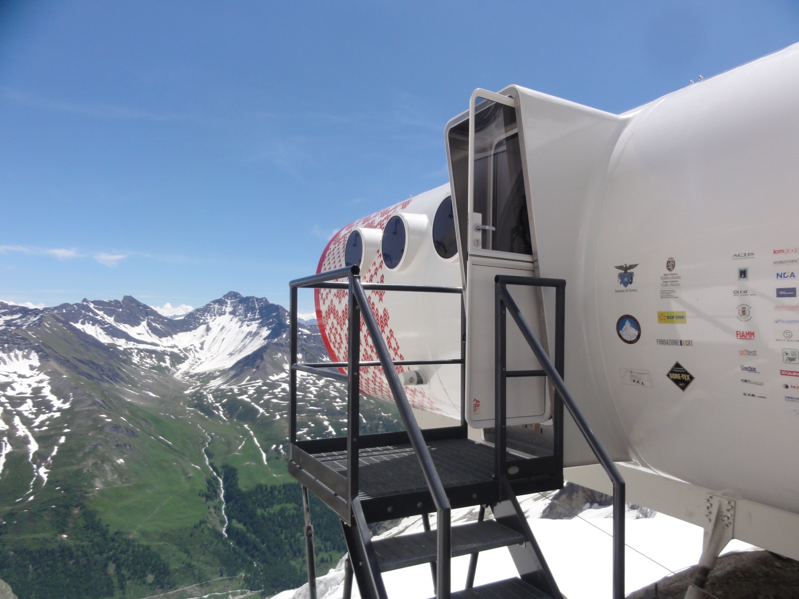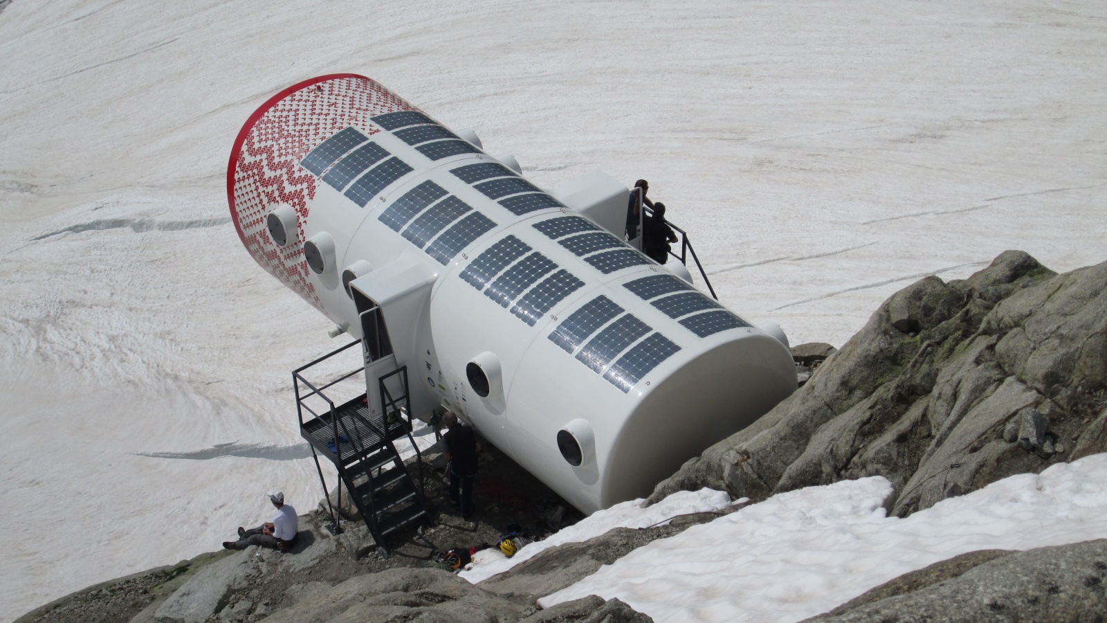 Projetada e construída pelos arquitetos italianos Luca Gentilcore e Stefano Testa, usando helicópteros para voar em cada seção, a nova estrutura exclusiva inclui áreas de estar e jantar e dois dormitórios que podem acomodar até doze pessoas. Qualquer pessoa capaz de fazer a escalada desafiadora de Val Ferret a pé é bem-vinda para visitar e se hospedar no acampamento. Com sua energia solar e acesso à Internet, este abrigo alpino moderno está muito longe da versão antiga de madeira.