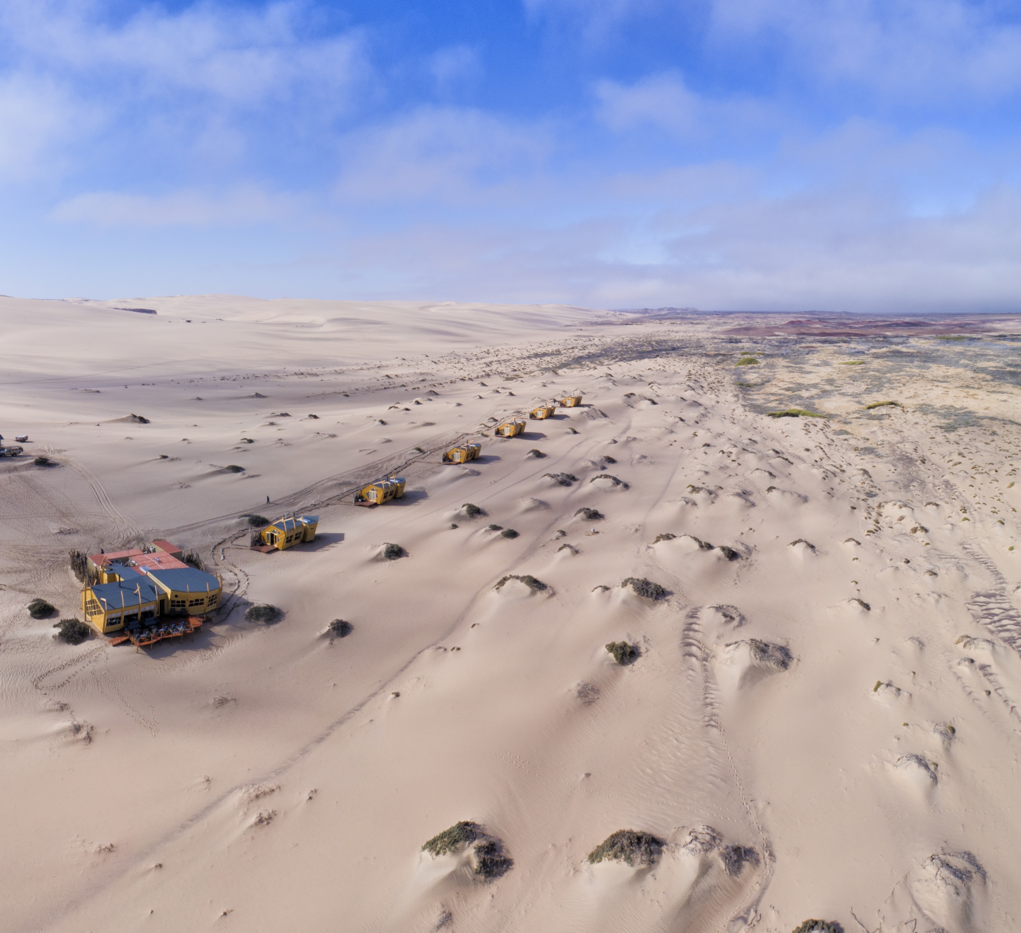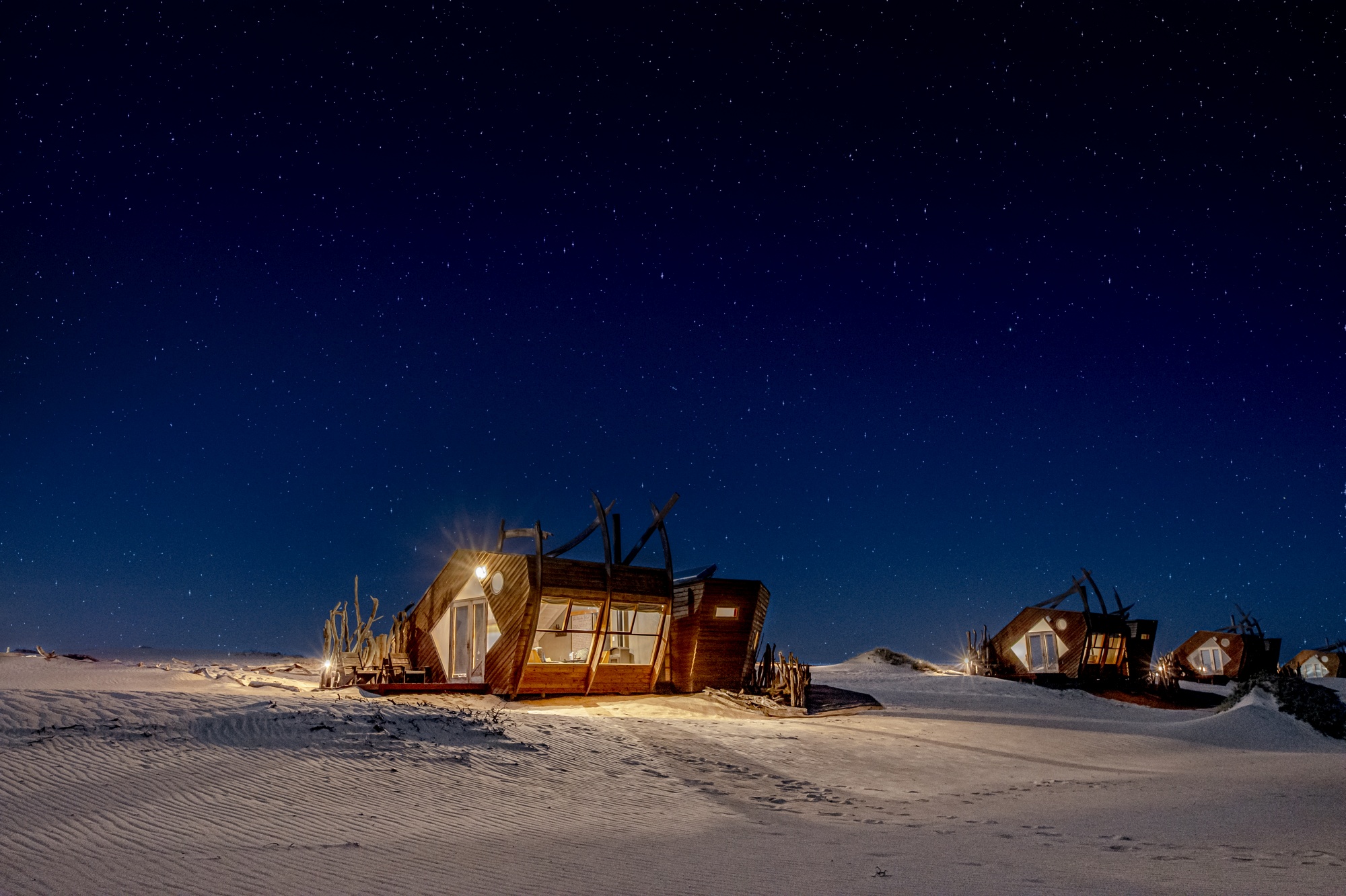 O alojamento está situado entre as dunas espetaculares e a costa do Oceano Atlântico. Existem dez cabines em forma de naufrágio para escolher. Oito gêmeos e duplos, e duas suítes familiares ecológicas que funcionam com energia solar. Eles são equipados com fogão a lenha e cobertores macios para as noites frias do deserto. As cabines possuem decks de madeira onde você pode admirar a beleza agreste do deserto da Namíbia. Há passeios diários para ver a colônia de focas na Baía de Möwe. Você pode alugar um quadriciclo para descobrir os segredos do Parque Nacional Skeleton Coast e tirar fotos dos destroços e ossos que encontrar no caminho. Que tal sandboard? A versão de verão do snowboard é um passeio emocionante pelas dunas épicas do deserto.