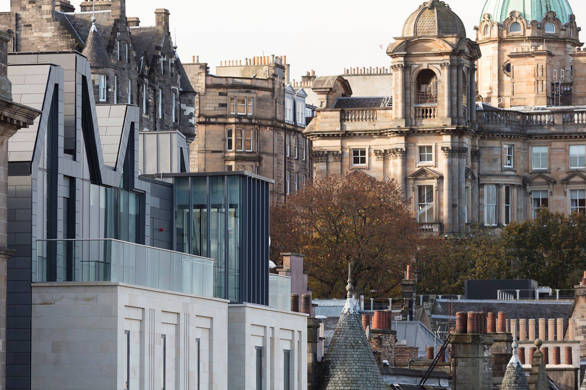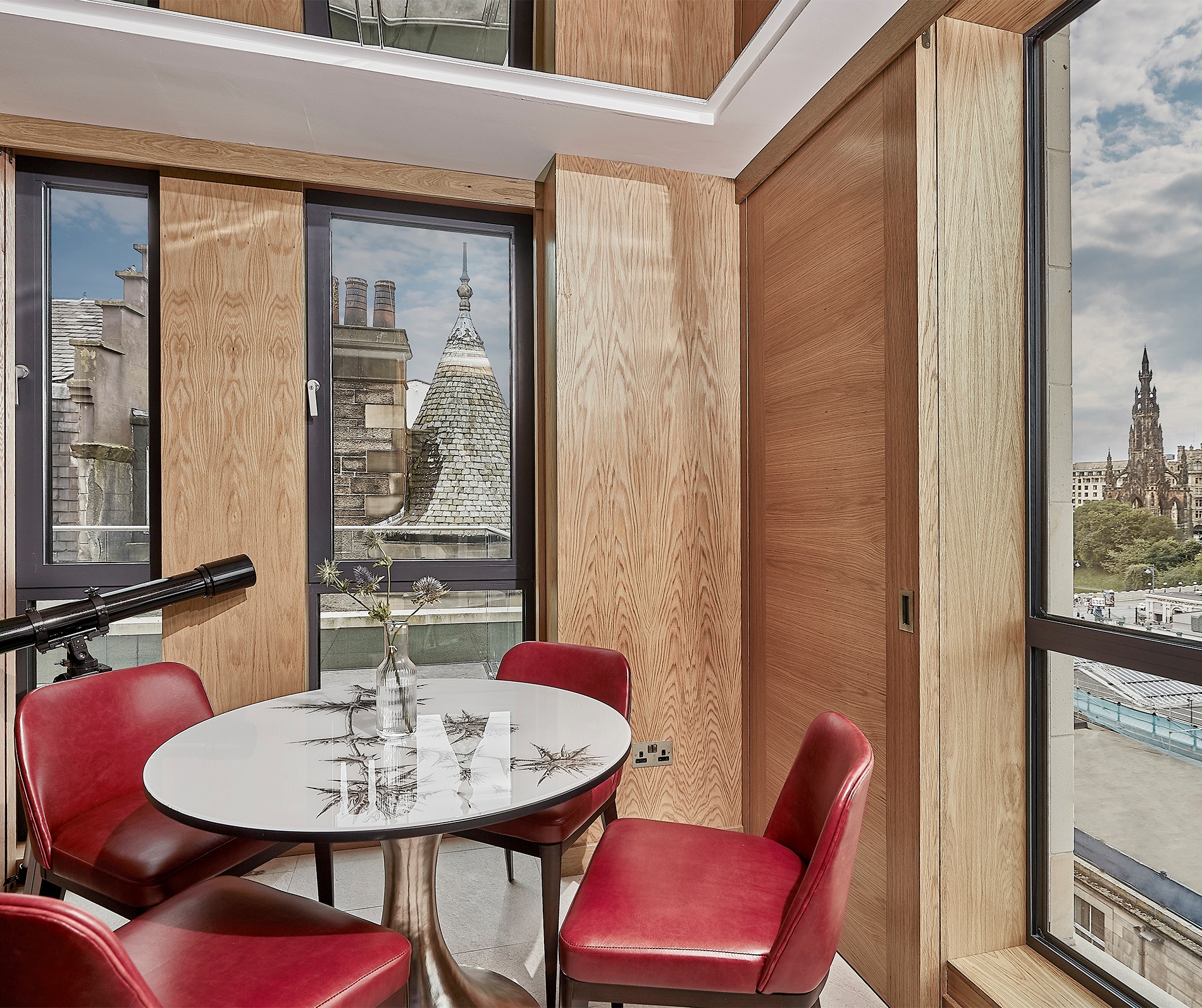 O maior desafio arquitetônico do Market Street Hotel foi caber um edifício moderno em um centro histórico protegido pelo Patrimônio Mundial da UNESCO. Os arquitetos de renome mundial JMARCHITECTS e o popular estúdio de design FG Stijl se uniram e fizeram um trabalho notável preenchendo uma lacuna no tradicional bairro escocês de Market Street, em Edimburgo, respeitando seu ambiente antigo. A silhueta alegre do telhado segue o mesmo padrão dos edifícios vizinhos. Até mesmo as venezianas corrediças de carvalho prestam homenagem às luminárias originais das janelas da histórica cidade.