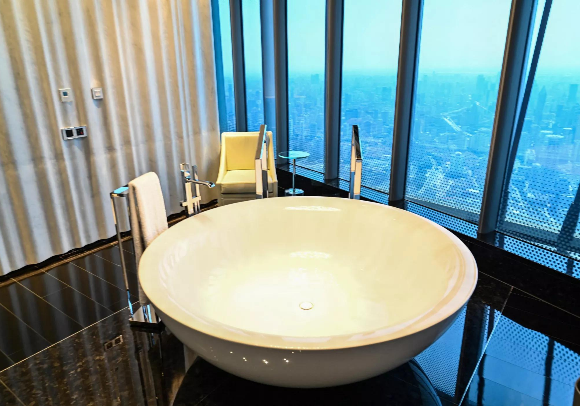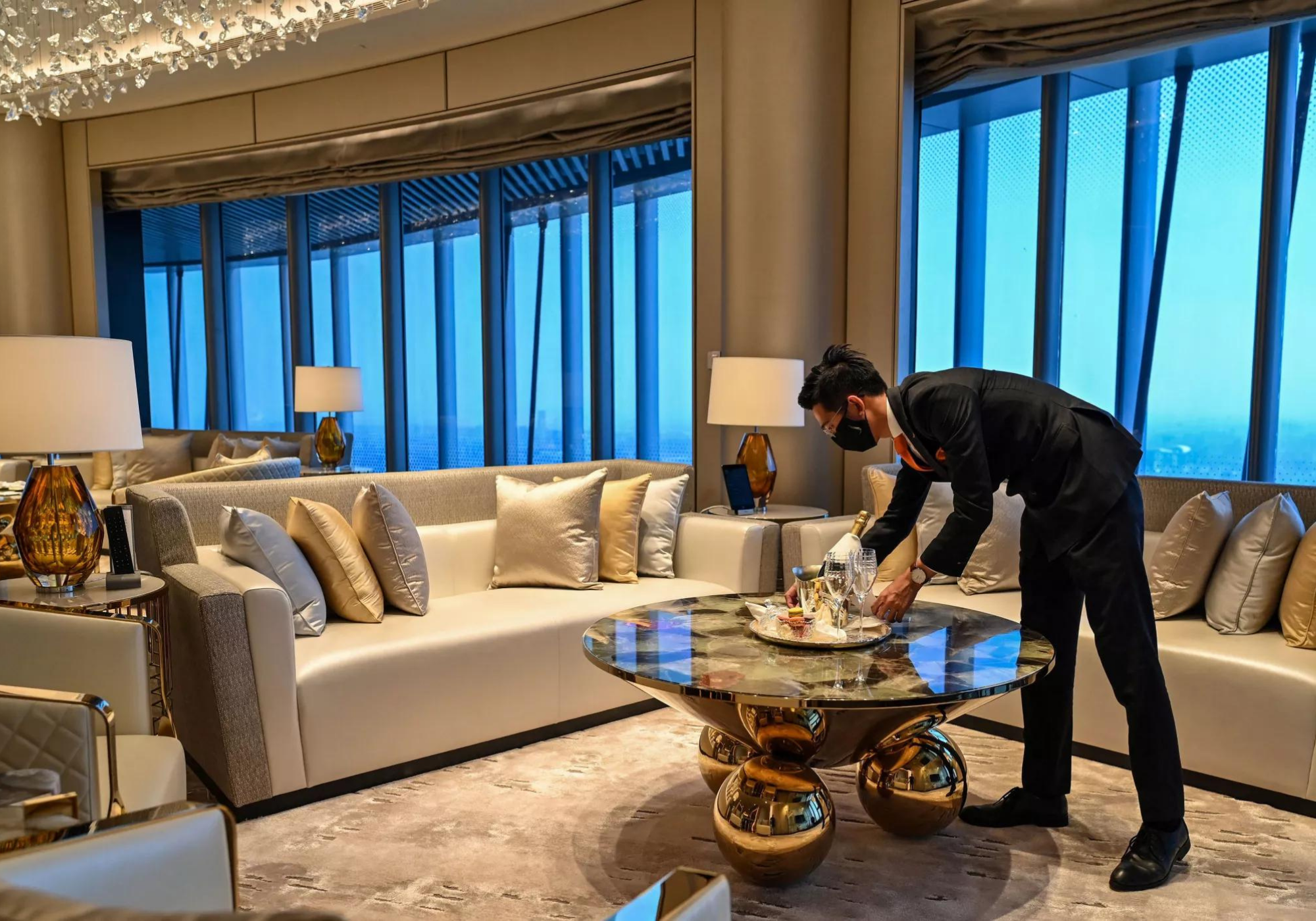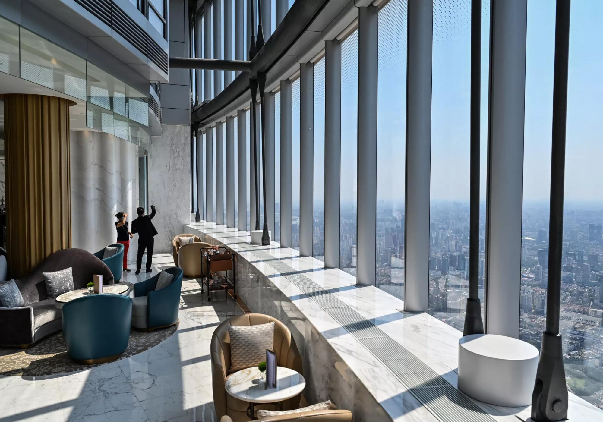 O hotel ocupa os andares superiores da Torre de Xangai, de 632 metros, no distrito financeiro da cidade, o segundo edifício mais alto do mundo depois do Burj Khalifa de Dubai.Sua inauguração foi atrasada em parte pela pandemia do coronavírus, mas o hotel agora começou a receber hóspedes que podem recorrer aos serviços de um mordomo dedicado a qualquer hora do dia ou da noite. Os clientes também podem desfrutar de sete restaurantes, bares, spa, piscina (localizada no 84º andar) e todas as outras instalações usuais de um hotel de primeira linha.
