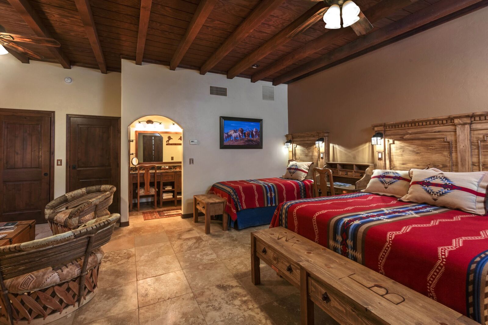 O rancho tem 43 quartos com interiores clássicos de estilo ocidental. O bar do White Stallion parece saído de um filme, com bancos de bar e uma ampla seleção de bebidas para algumas noites alegres. A sala de jogos está equipada com shuffleboard, pebolim, air hockey e mesa de bilhar. Quem gosta de esportes ficará feliz em saber que há quadras de vôlei, basquete, badminton e tênis ao ar livre. E se você teve um longo dia cavalgando, a banheira de hidromassagem de sequóia se tornará sua melhor amiga.