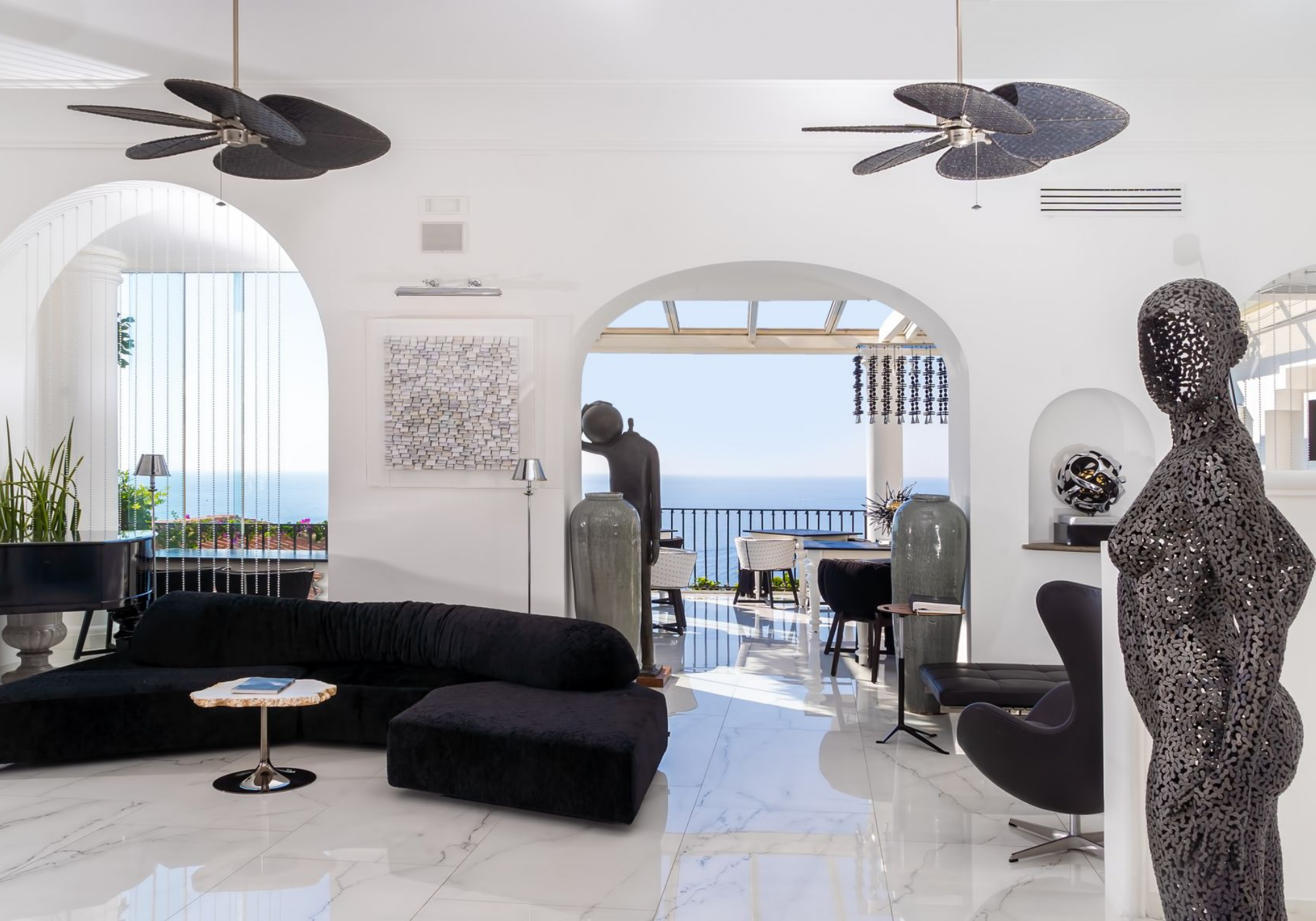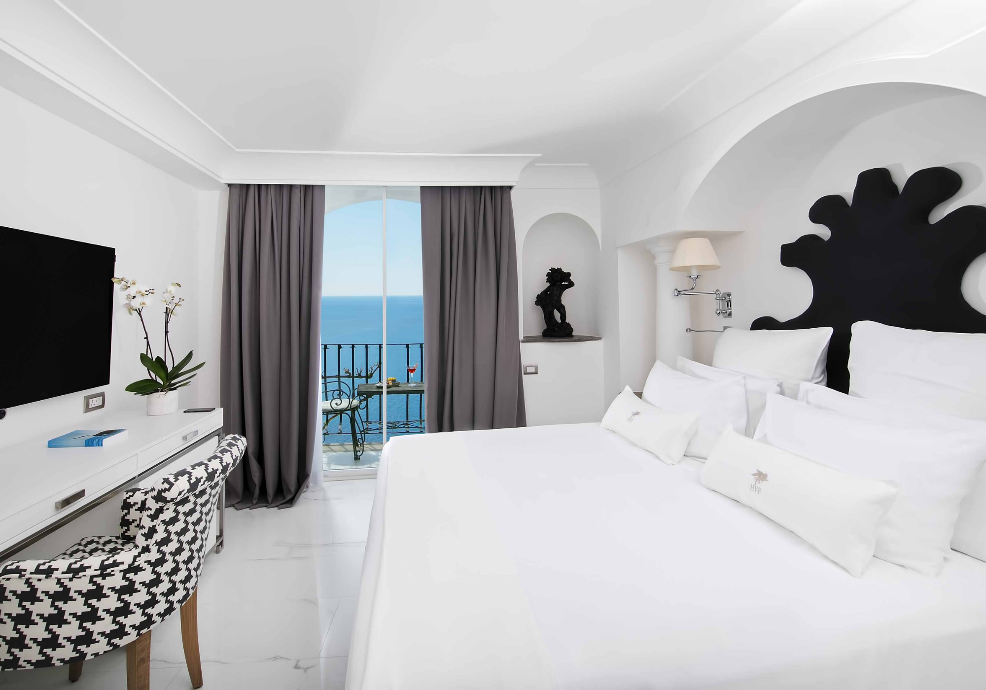 No momento em que você entra no abraço calmo do Hotel Villa Franca, uma sensação de paz mística inunda você como uma onda fria envolvendo pedras queimadas pelo sol. A vibração artística tranquila desta antiga residência privada chega aos proprietários e hoteleiros de terceira geração Rosa Taddeo e Massimo Napoli, que são responsáveis por decorar a casa boutique de propriedade familiar com peças de arte moderna locais e internacionais. Cada uma das suítes é dedicada a um de seus artistas contemporâneos favoritos, e tudo, desde os elegantes lençóis sob medida até os elegantes talheres de ouro, foram selecionados manualmente pela dupla talentosa.
