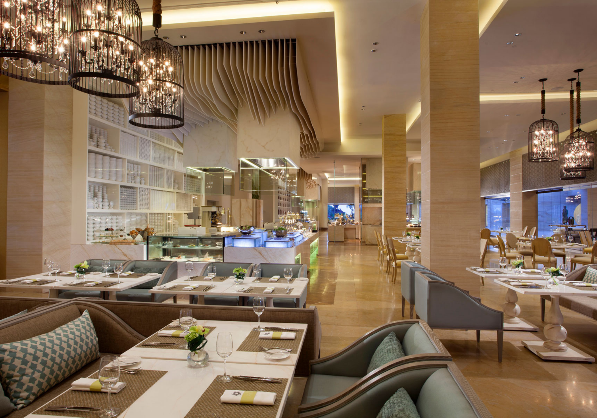 Há quatro restaurantes e cinco bares, bem como um punhado de opções gastronômicas exclusivas para os hóspedes do The Mulia ou Mulia Villas, como um chá da tarde de cortesia com coquetéis. Um buffet de café da manhã é servido no The Café, com uma variedade impressionante de opções que vão do asiático ao ocidental, e uma sala de sobremesas com bolos, biscoitos, gelato, donuts e doces. O Table8 serve cozinha cantonesa e de Sichuan, enquanto o refinado Soleil à beira da piscina oferece pratos mediterrâneos e pan-asiáticos, e o Edogin oferece um buffet de Teppanyaki à noite. Os sofisticados bares internos, externos, ao lado da piscina e aquáticos servem uma variedade de vinhos, cervejas, coquetéis tropicais, destilados e tapas.