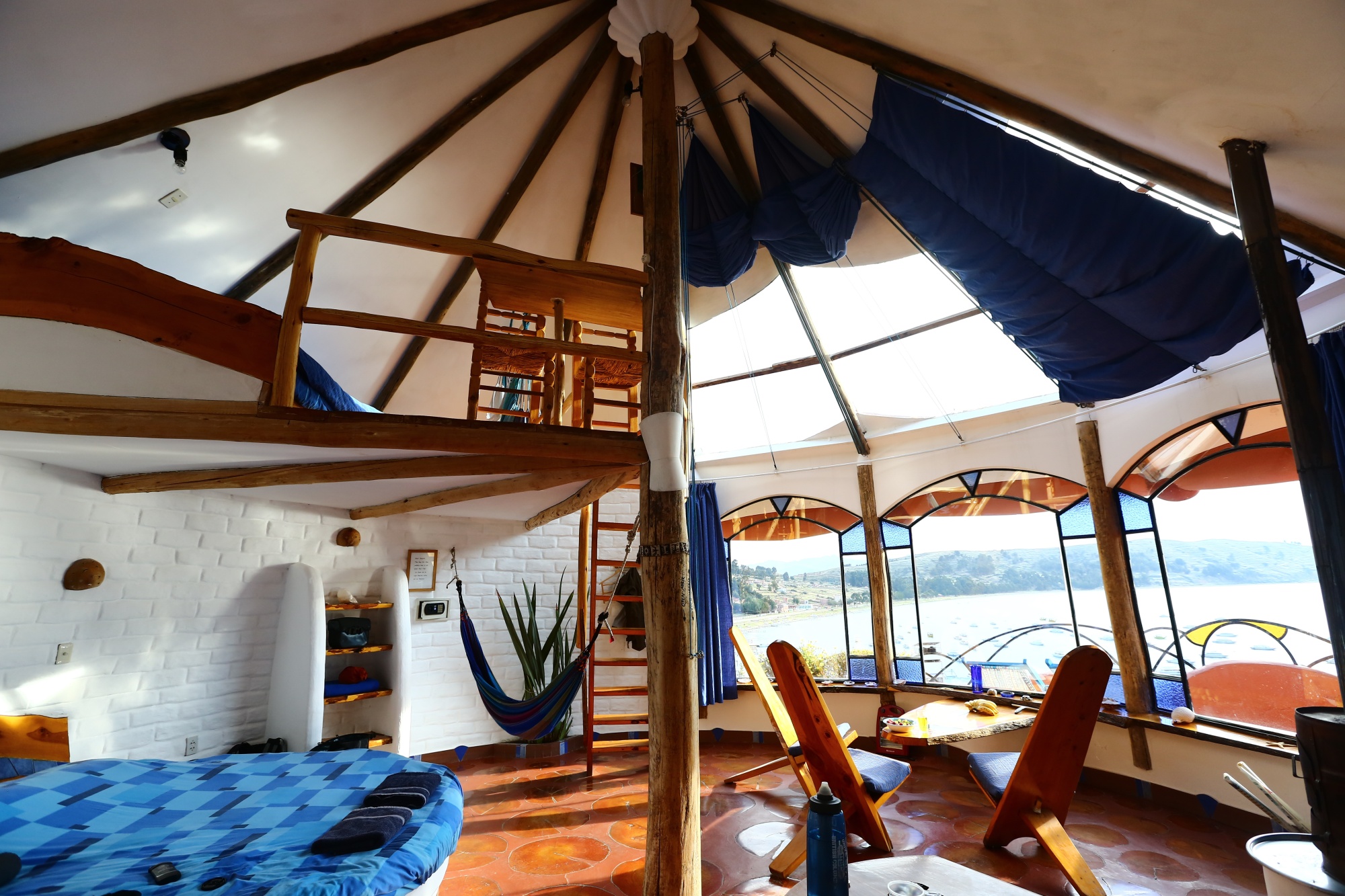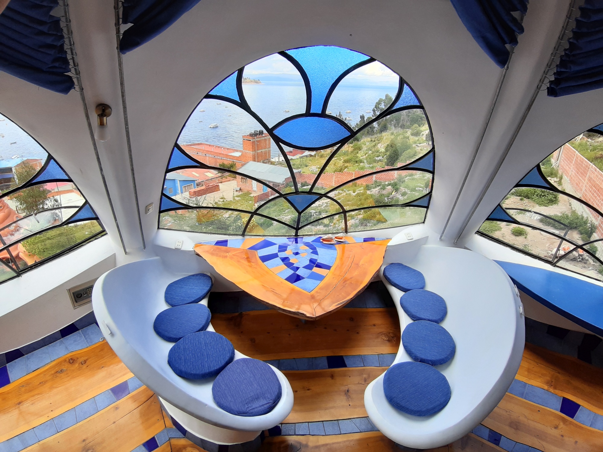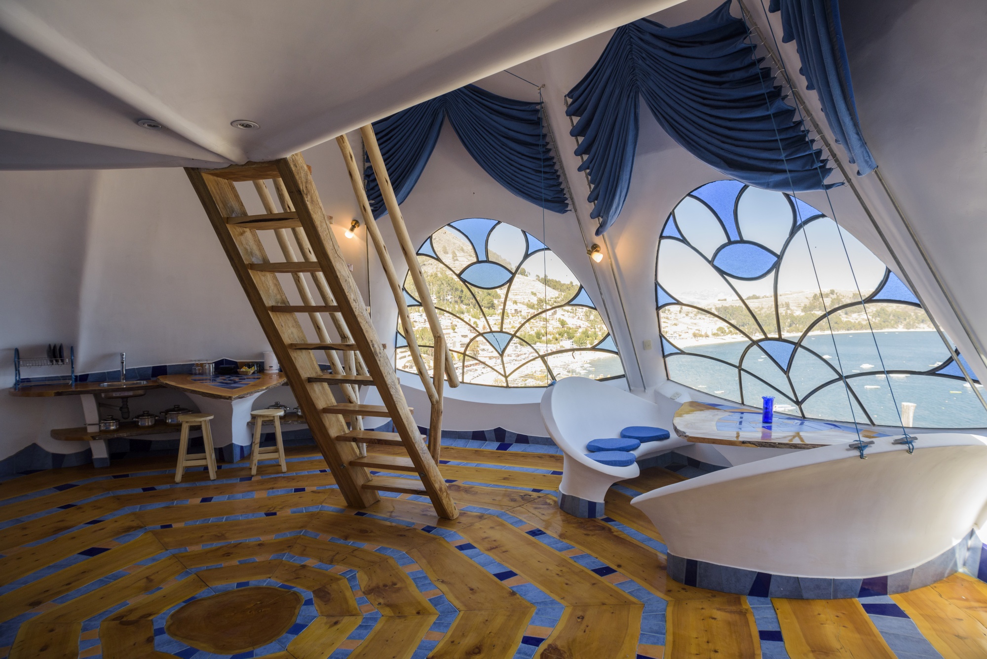Indo para Copacabana? A Copacabana boliviana! A cidade do entorno do Lago Titicaca na Bolívia, de onde saem os barcos que fazem a visita à Ilha do Sol, uma ilha sagrada dos Incas, é onde se encontra um lugarzinho peculiar chamado Hostal Las Olas Guesthouse. É um complexo de dez vilas privadas, todas em formas diferentes e com interiores exclusivos, como conchas, castelos, tendas e cavernas.