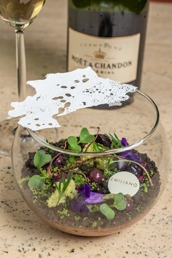 Na entrada, um prato em homenagem ao enorme jardim vertical do Restaurante Emile, veloute de lagosta com caviar, mini jardiniere de aspargos e manteiga de baunilha, uma entrada delicada e contemporânea. Já no principal, o jovem Chef Camilo elaborou um pato glaceado no vinho do porto com mousseline de cenoura tostada, gel de cupuaçu e pólen de abelha, um prato típico francês porém com toque brasileiro. E para finalizar a Chefe pâtisserie Luisa Jungblut preparou com muita delicadeza o terrario de mousse de Chocolate 80%, texturas de jabuticaba e tuile branca que remete aos cobogós da faixa do Emiliano Rio.