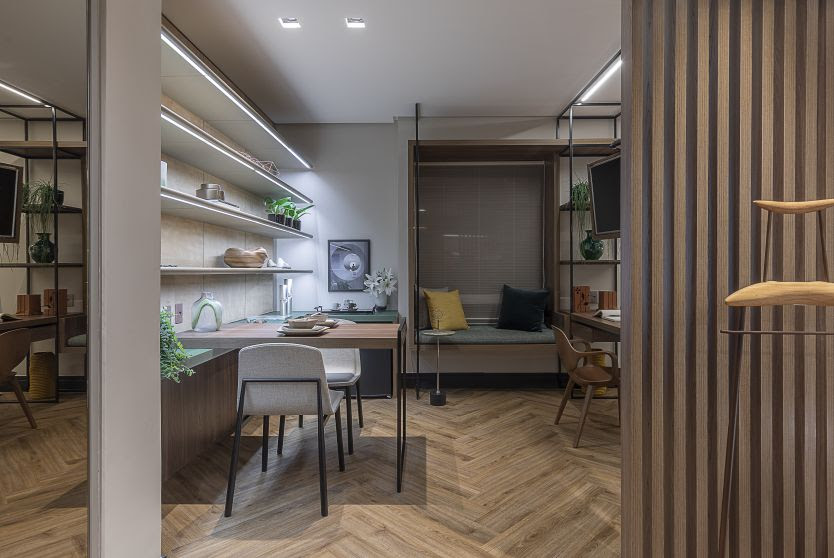Com o intuito de promover um lugar funcional, a designer elegeu um móvel-escrivaninha, televisão pivotante – com a possibilidade de o hóspede poder assistir tanto da cama quanto da mesa de refeições e no espaço office. Por fim, um banheiro acolhedor, convidativo ao relaxamento e ao bem-estar com um espaçoso box com nicho embutido e uma bancada generosa, suficientes para atender e encantar os hóspedes na sua estadia.