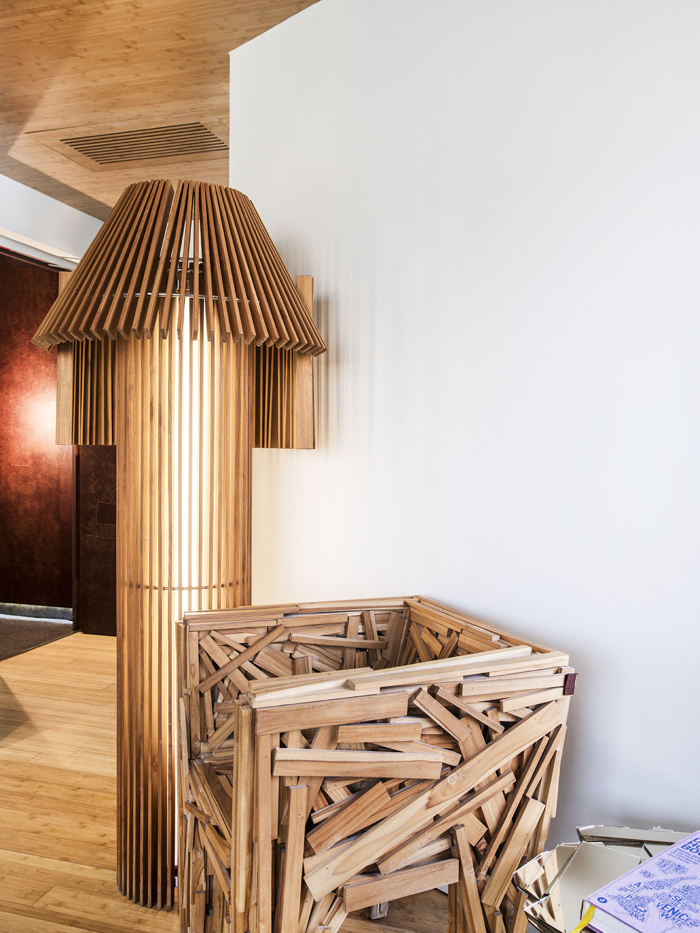 Algumas cadeiras foram deixadas como estavam, enquanto outras foram emendadas com objetos atípicos para criar formas novas e intrigantes. Nos salões, incríveis esculturas em forma de árvore de vários tons, cuidadosamente montadas a partir de uma mistura de madeiras de cores diferentes, alcançam o céu a partir do chão.