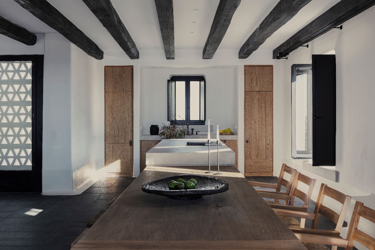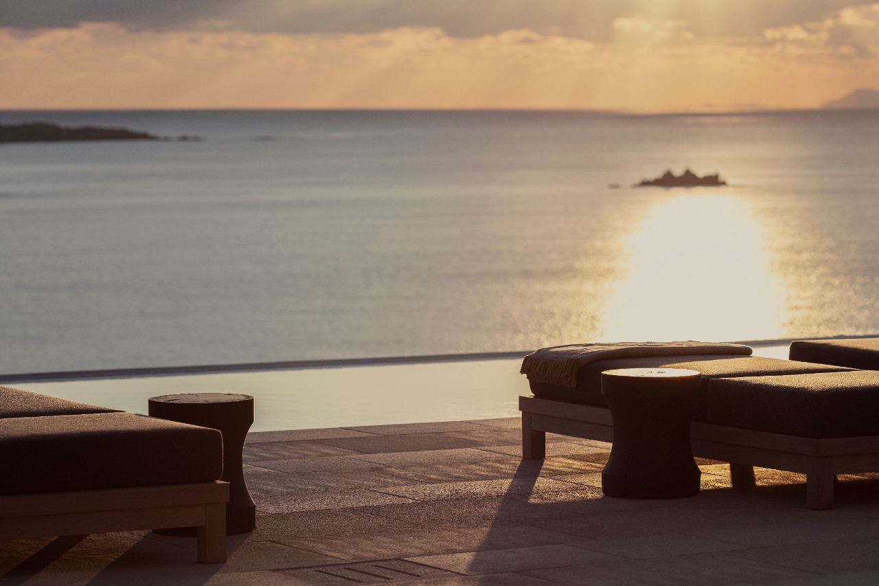 Combinando elementos contemporâneos com materiais de origem local, a arquitetura é um destaque a parte, tanto que recebeu dois prêmios no 100% Hotel Design Awards, nas categorias ‘Melhor Quarto/Banho’ e ‘Melhor Lobby/Recepção’ em 2021. A estética do hotel, elaborada pelo conceituado escritório de design grego K-Studio, remete diretamente a uma típica e encantadora vila de Mykonos com uma coleção de casas caiadas brancas formando as villas e suítes do hotel. Já a decoração e design de interiores é de Vangelis Bonios que optou por uma paleta de cores neutras e terrosas e materiais que trazem a sensação de conforto com muita atenção aos detalhes.