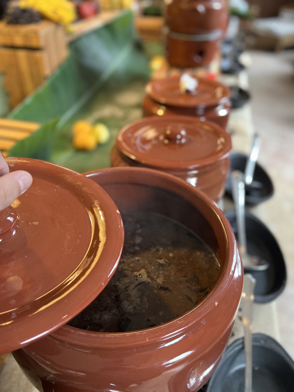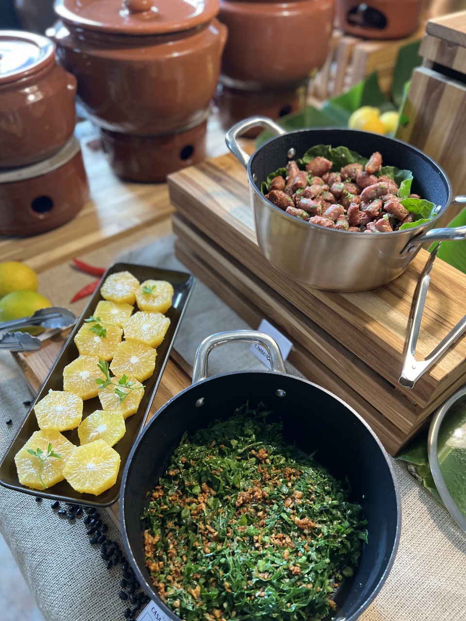 O almoço no hotel-boutique, com vista para os jardins de Burle Marx, começa com aperitivos – torresmo, linguiça suína, aipim cozido e caldinho de feijão – e cinco tipos de saladas para a entrada.