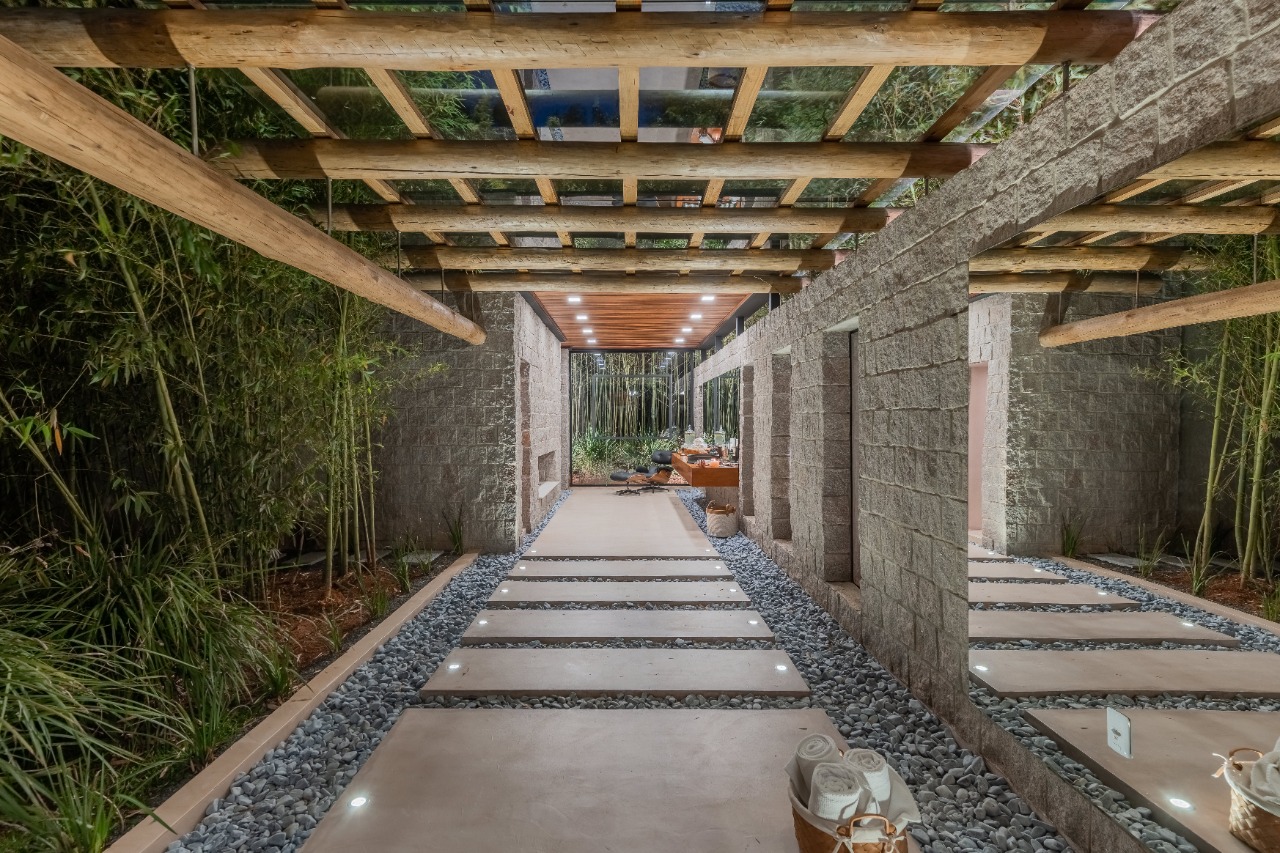 Para o SPA de flutuação, foi pensado um circuito de espaços que levassem a pessoa a sutis conexões com a natureza, seja pela abundância de iluminação e de ventilação natural, seja pela presença de elementos – nos verdes como o bosque de bambu, na água da ducha externa ou banho de chuva e no fogo da lareira.