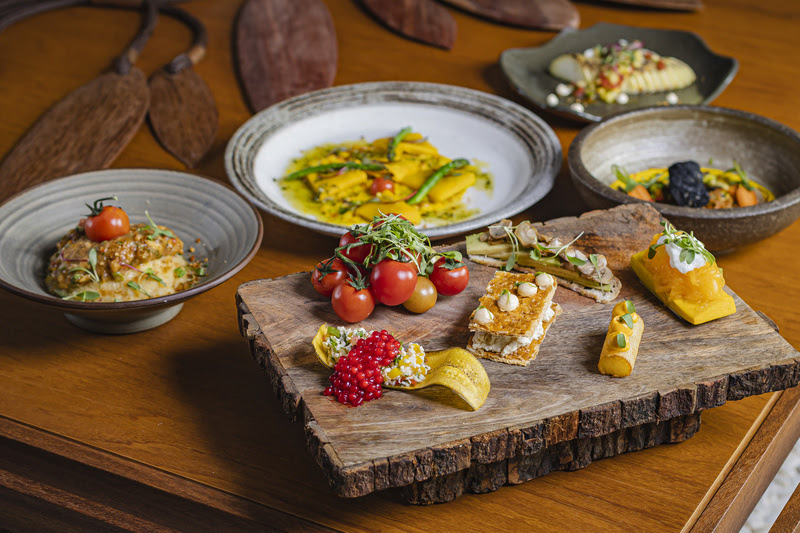 Empanado de mil folhas com tataki de tofu, molho oriental • Tapas de cogumelos com pasta de abacate • Batata brava, salsa picante • Crocante de banana da terra, tartar de palmito, caviar de tomate • Mini moranga assada, ragu de mamão verde, espuma de iogurte
