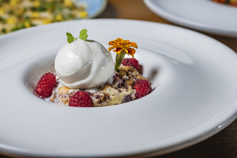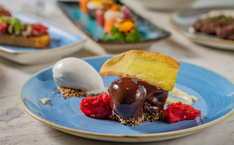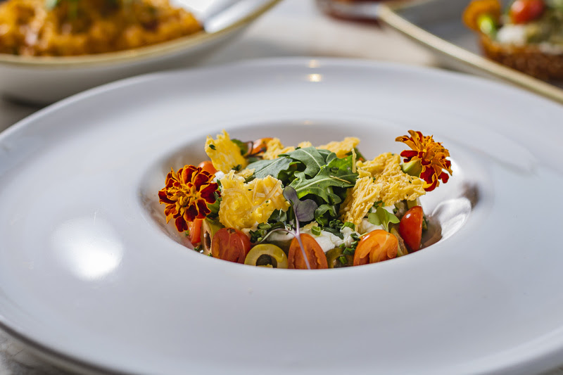 Na versão vegetariana da ceia, o menu inicia com uma seleção vegana de gunkans, bruschetta de berinjela e salada caeser. O risotto de tomate e trufas é servido como primeiro prato, com a berinjela defumada dando sequência ao jantar. Em ambas as opções, de sobremesa está uma joia da confeitaria — o entremet de chocolate 54%, com chips de mandioquinha e sorvete de amendoim.