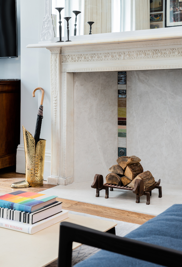 Outras referências à loja principal da Albemarle Street, localizada a poucos metros do hotel, estão espalhadas pelo quarto. Eles incluem tapetes personalizados Paul Smith + The Rug Company e uma cabeceira Maharam, ambos com um padrão geométrico inspirado na icônica fachada de ferro do edifício. Detalhes singularmente peculiares, como as maçanetas de banana, os ‘cães’ de fogo (que foram feitos sob medida para se assemelhar a Homer, o primeiro lojista canino de Paul), uma estatueta de robô feita de uma câmera vintage e os ladrilhos listrados da lareira, são abundantes no espaço, um reflexo da filosofia de ‘clássico com um toque’ de Paul e seu senso de humor caprichoso, sua marca registrada.