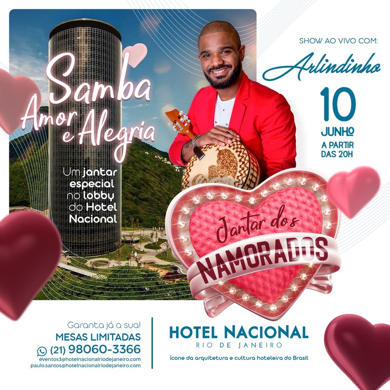 O romantismo vai invadir com tudo as dependências do Hotel Nacional no Dia dos Namorados sem pedir licença. No próximo dia 10 de junho, a partir das 20h, na área do lobby, os hóspedes e o público em geral poderão curtir um jantar especial ao som da voz do cantor Arlindinho Cruz.