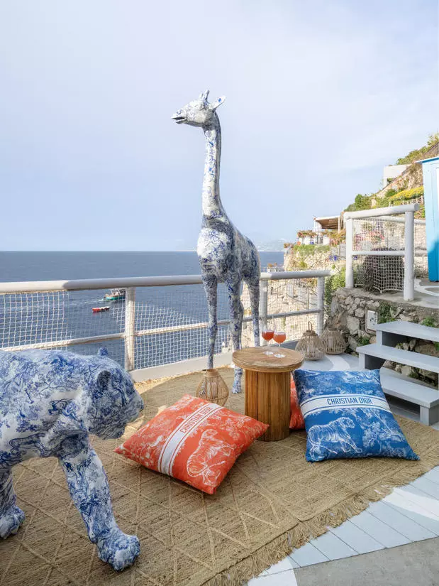No II Riccio, exclusivo beach club que faz parte do hotel boutique JK Place Capri, a Dior inaugurou outra pop-up store sofisticada e repleta de itens exclusivos. Com direito a almofadas personalizadas com o nome do estilista icônico Christian Dior e grandes esculturas de animais nas cores características azul e branca, o espaço traz conforto e beleza aos olhos dos visitantes. Todo o cenário paradisíaco é completado com a vista deslumbrante para as águas azuis do Mediterrâneo.