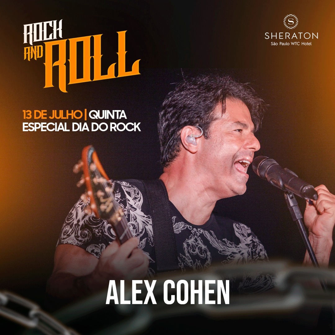 Em homenagem ao Dia Internacional do Rock, celebrado no dia 13 de julho, o hotel Sheraton São Paulo WTC recebe o cantor Alex Cohen para embalar o público com clássicos do rock internacional. O show, que acontece das 20h às 22h, promete fazer o público cantar grandes sucessos, como Hotel Califórnia, Sweet Child o’ Mine e Sultains of Swing.
