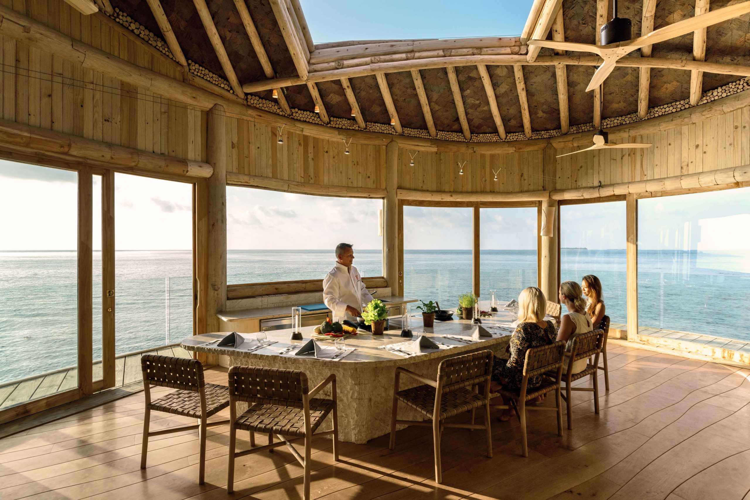 A decoração interna das vilas eco-friendly do Soneva Fushi é uma mistura sutil e cativante de influências locais e design contemporâneo. Utilizando materiais naturais como madeira e pedra, cada vila possui um ambiente acolhedor e sofisticado, ecoando a essência das Maldivas. As vilas espaçosas são verdadeiros retiros, com espaços de estar internos e externos que permitem que os hóspedes se conectem profundamente com a natureza circundante.