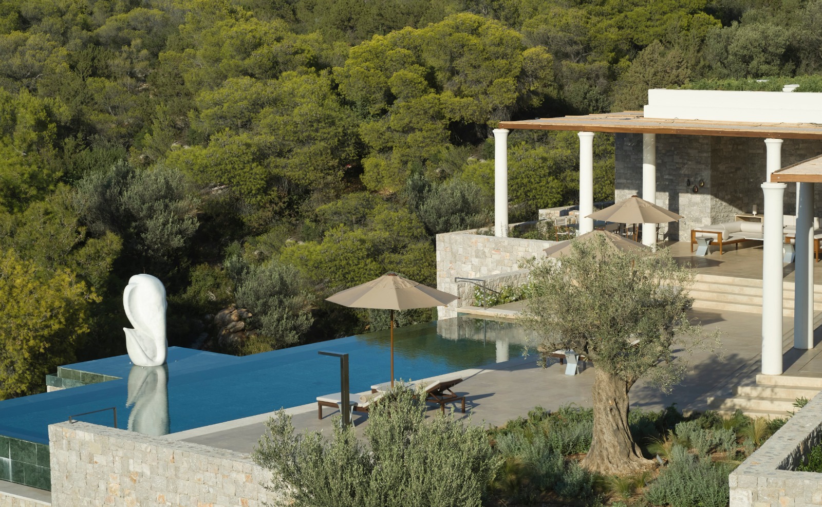 Aninhado na base da colina, numa baía abrigada, o Amanzoe desfruta de uma praia privativa, onde uma gama de atividades aquáticas não motorizadas é oferecida, e um clube de praia equipado com piscinas, restaurantes e cabanas, proporcionando uma estadia inigualável para casais. As acomodações do Amanzoe são verdadeiras joias de design e conforto. Combinando influências gregas tradicionais com um toque moderno, os espaços são largos, elegantes e cuidadosamente decorados. Os pavilhões privativos oferecem vistas panorâmicas do mar ou das colinas exuberantes, garantindo um ambiente sereno para os hóspedes relaxarem e se desconectarem. Piscinas particulares, terraços espaçosos e áreas de estar confortáveis complementam o visual.