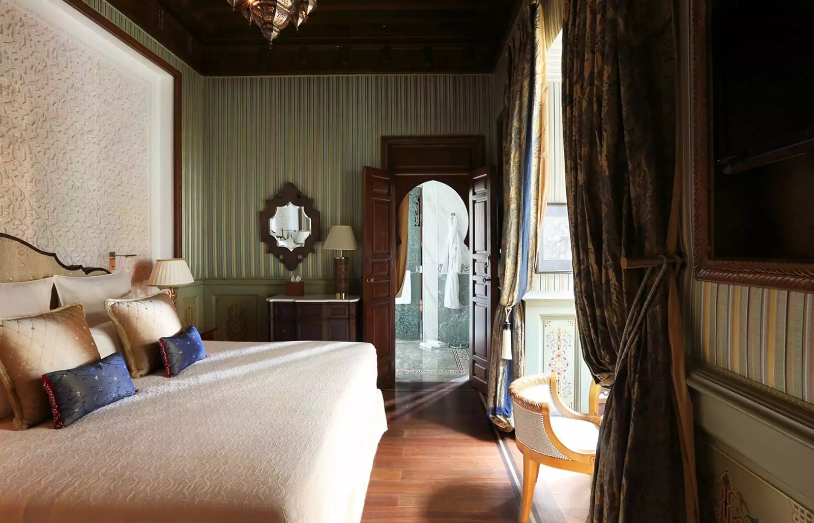 A decoração do Royal Mansour é uma celebração da rica herança artística de Marrocos. Os interiores deslumbram com mosaicos complexos, intrincadas talhas em madeira de cedro e luminárias personalizadas que proporcionam uma iluminação suave e acolhedora. Cada canto do hotel é um tributo à destreza artesanal local e ao amor pela estética marroquina.