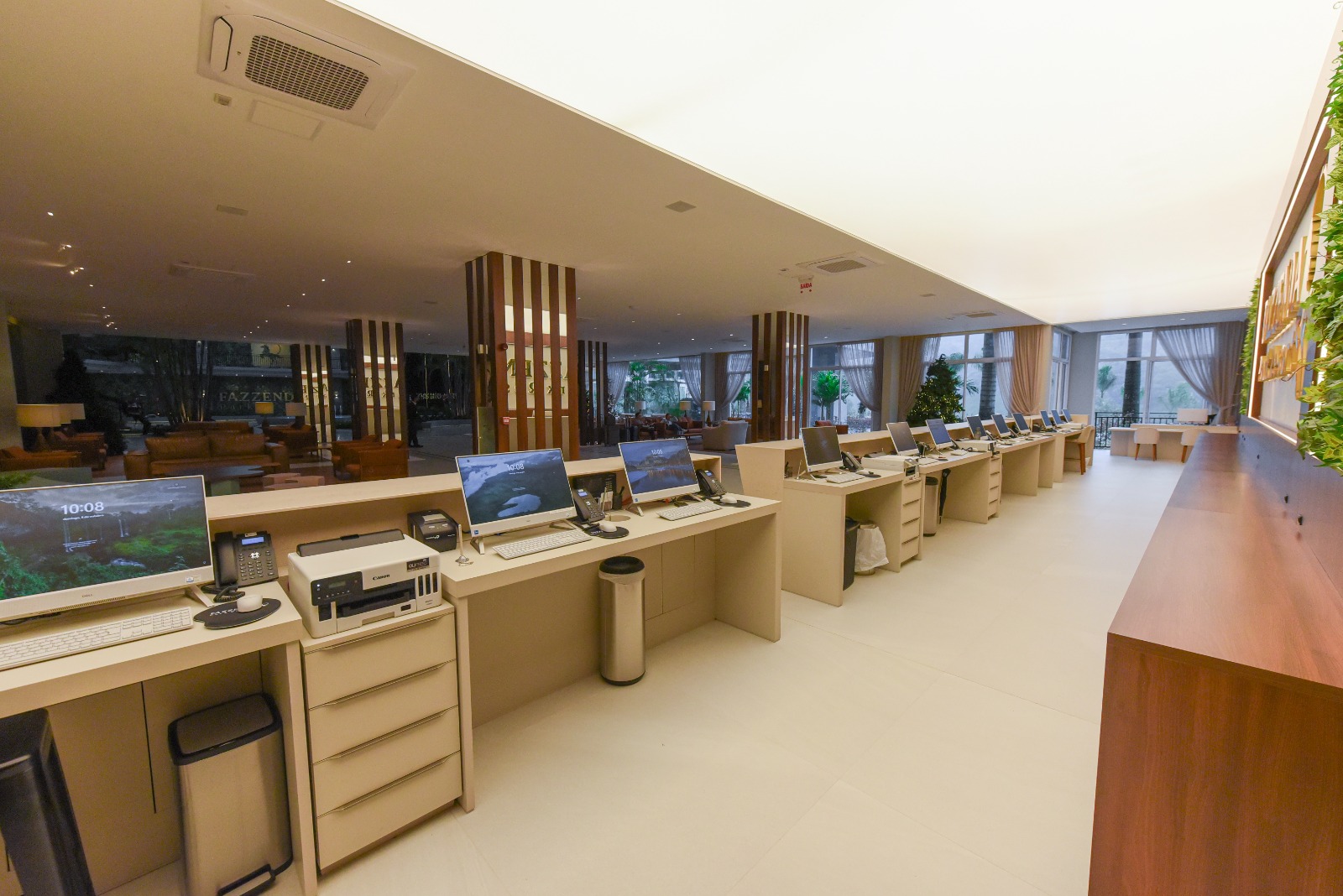 A nova recepção apresenta 12 guichês de atendimento, um guichê preferencial e, em fase de testes, quatro totens de autoatendimento. Com um espaço total de 500m², a recepção é complementada por uma cobertura de 340m² para as chegadas de veículos e um amplo lobby de 900m², com canteiros, caminhos, chafariz e bar.