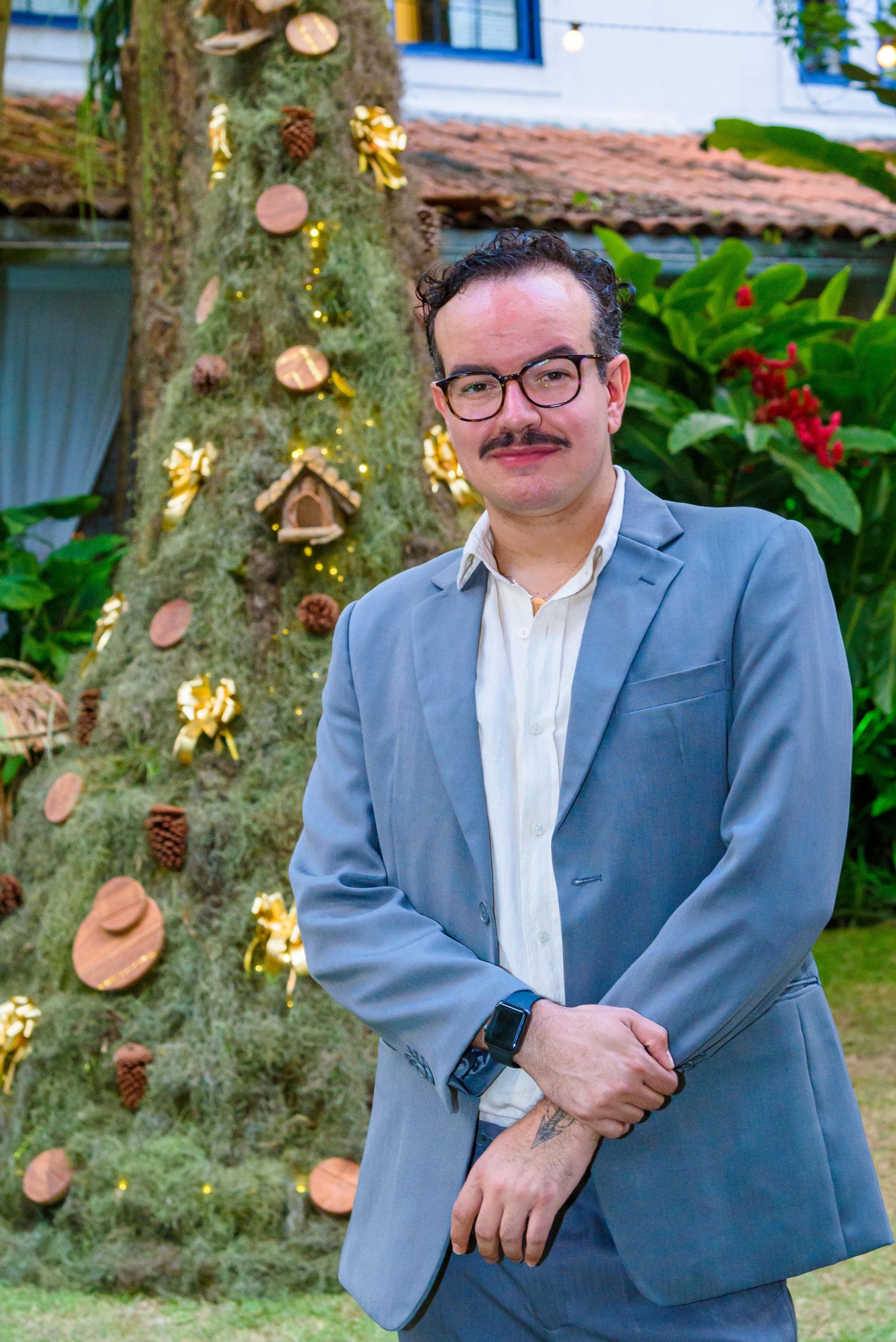 “A árvore, completamente natural, transmite essa essência ao ser revestida com a bromélia camambaia, também conhecida como barba-de-velho. Essa espécie, com uma ampla distribuição natural que vai da Flórida ao sul da América do Sul, se integra ao ambiente de maneira harmoniosa. Sua estrutura natural de plantas se funde de modo suave ao cotidiano das espécies animais residentes no Hotel Santa Teresa, tornando-se uma adição ao habitat natural delas, sem causar interferências. A barba-de-velho, utilizada pelos pássaros na construção de seus ninhos, não apenas desempenha essa função, mas também contribui para a purificação do ar, sendo empregada como parte das estratégias de controle ambiental. As esferas ornamentais da árvore são confeccionadas a partir de madeira de cumaru, proveniente dos cortes excedentes do meu escritório, que, de outra forma, seriam descartados. Segundo a Secretaria de Estado de Meio Ambiente e Desenvolvimento Sustentável (SEMAD), os resíduos gerados pela construção civil podem representar até 70% da massa total de resíduos nos municípios brasileiros. A atenção dos operários da construção é essencial para modificar essa estimativa. As bolas em si são verdadeiras obras de arte, resultado de um meticuloso processo de seleção, colagem e aplicação de folhas-de-ouro, conferindo um toque natalino à composição. A árvore carrega diversos simbolismos e significados, desde aspectos formais até a escolha de materiais. Eu, com princípios da sustentabilidade e história, incorporo esses elementos nesta escultura. Materiais brasileiros, explorados desde a colonização, como a madeira, o ouro, e elementos da flora e fauna, estão presentes nessa composição. A construção histórica do hotel, datada de 1850 e anteriormente uma fazenda de café, agora primorosamente recebe os hóspedes, proporcionando-lhes uma sensação de conforto semelhante à de suas próprias casas. Essa atmosfera me inspirou a explorar formas diversas de residências, incluindo algumas destinadas a abrigar pássaros.” Completou o designer.