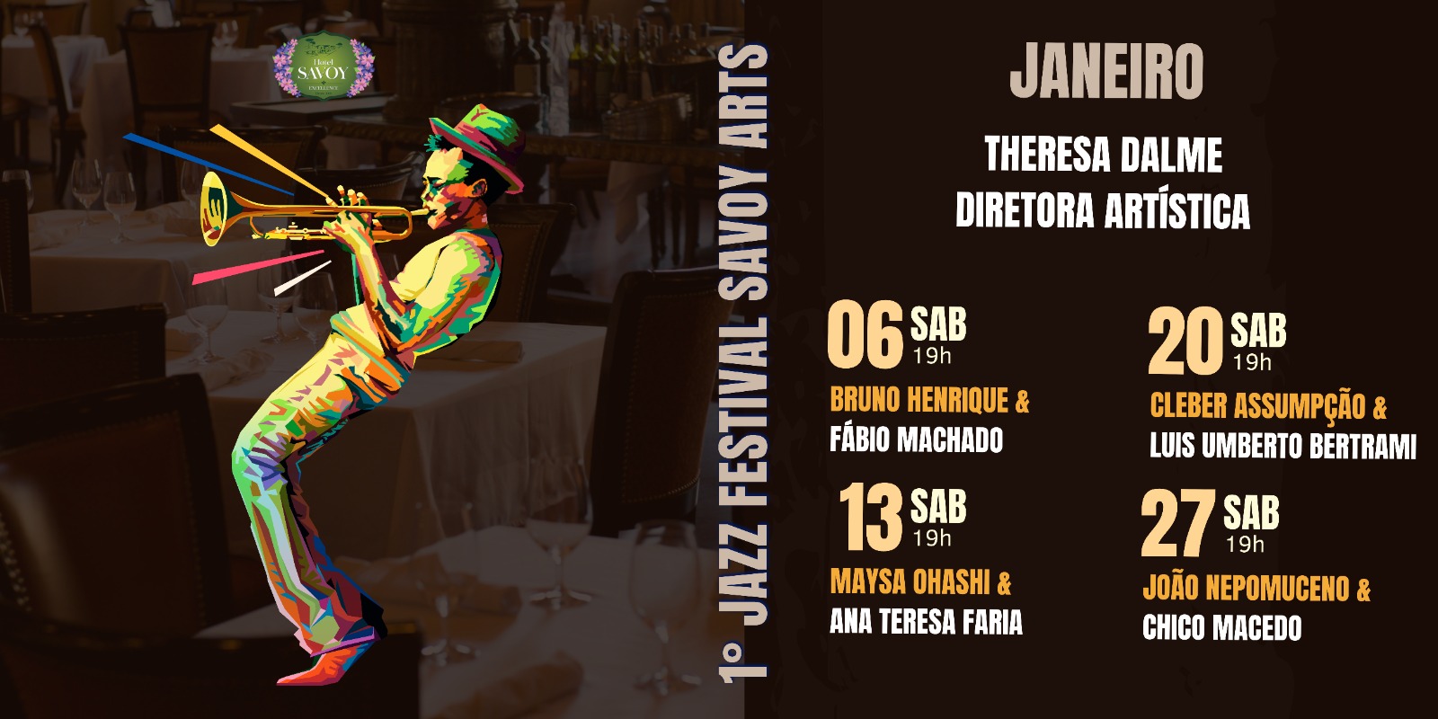 O Hotel Savoy Excellence Campos do Jordão abre o ano com o “1º Jazz Festival Savoy Arts”, que acontece em janeiro com a participação de grandes músicos. Sob a coordenação da diretora artística Theresa Dalme, o evento conta com apresentações aos sábados, sempre a partir das 19h, com entrada gratuita.